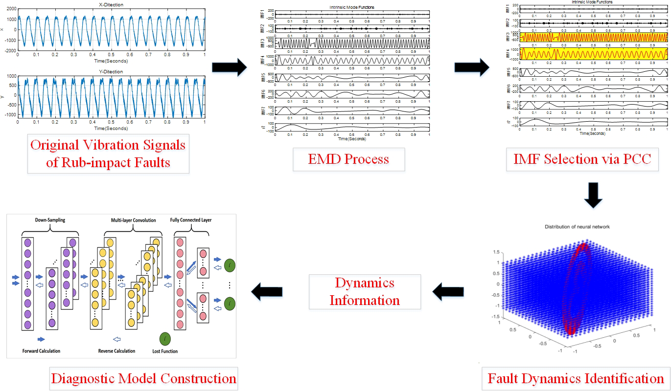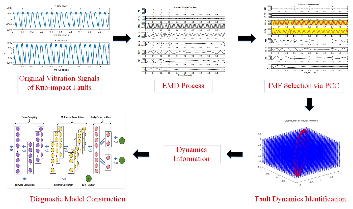 Inspired by the above methods, a new rub-impact fault diagnosis method based on EMD and dynamic CNN is proposed. Firstly, the original vibration signals are decomposed using EMD to obtain fault-related IMF components. Then, the most correlated IMF components are selected via the Pearson correlation coefficient (PCC) and are input into the dynamic CNN model for feature learning and fault classification. The fault dynamics of the selected components are identified based on dynamic learning, which means they are more sensitive to the small faults in the initial stage. The diagnostic model is constructed based on the identified fault dynamics information. By combining the adaptive signal decomposition capability of EMD and the deep feature extraction capability of dynamic CNN, this method can effectively improve the diagnostic accuracy and robustness of rotor rub-impact faults. Furthermore, the misjudgment self-correction mechanism is implemented by embedding the comparison of fault dynamics. Compared with the traditional methods, the experiments results illustrate that the proposed method can detect the rub-impact faults more effectively.