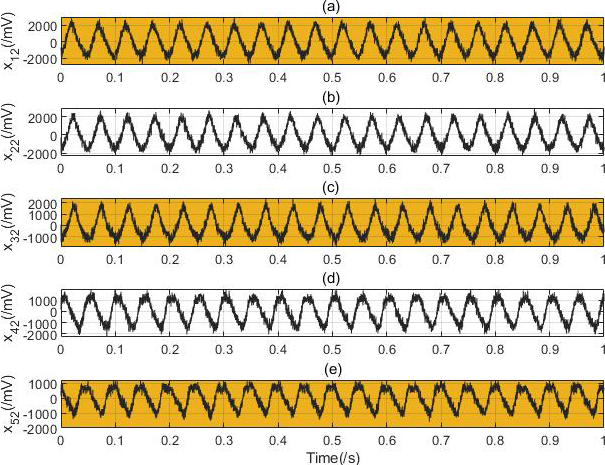 The correlated IMFs are selected based on the PCC with γ≥0.35, and the reconstructed vibration signals are shown in Fig. 9. It can be seen that the original signals are drowned out by noise signals, and the reconstructed signals associated with the selected IMFs can perfectly match the original signals of Fig. 9. Regarding the vibration signals in the Y direction, the EMD and PCC are implemented in the same way to obtain the reconstructed signals. x13, x23, x33, x43, and x53 represent the reconstructed vibration signals of the normal pattern, slight fault pattern, moderate fault pattern, severe fault pattern, and failure pattern in the X direction, respectively.