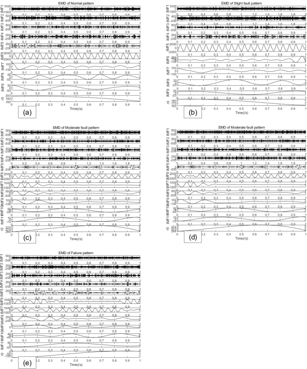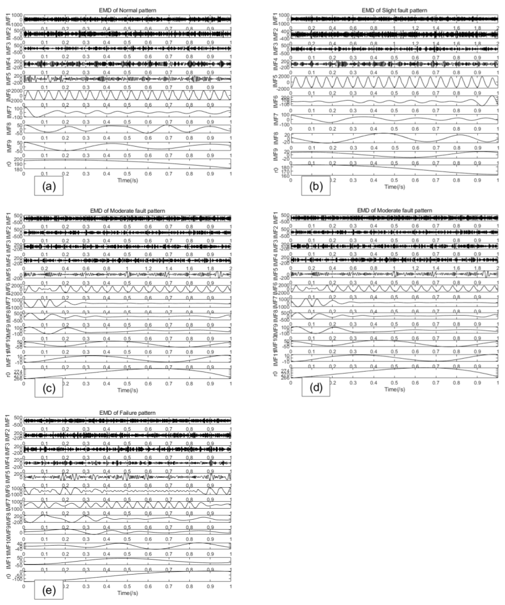 Figure 8IMF decomposition of five different fault patterns: (a) normal pattern, (b) slight rub-impact fault pattern, (c) moderate rub-impact fault pattern, (d) severe rub-impact fault pattern, and (e) failure rub-impact pattern.