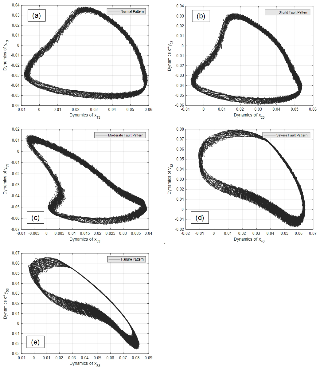 Figure 11Dynamics trajectories of the five kinds of rub-impact faults: (a) normal pattern, (b) slight rub-impact fault pattern, (c) moderate rub-impact fault pattern, (d) severe rub-impact fault pattern, and (e) failure rub-impact pattern.