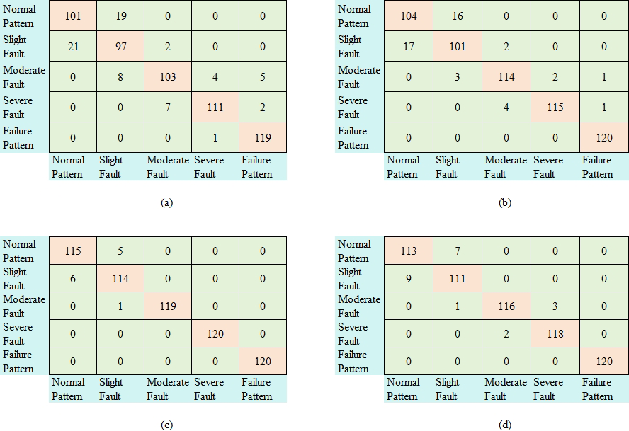 Figure 12Diagnosis results of Experiment 1 without noise (a) based on Classifier 1, (b) based on Classifier 2, (c) based on Classifier 3, and (d) based on Classifier 4.