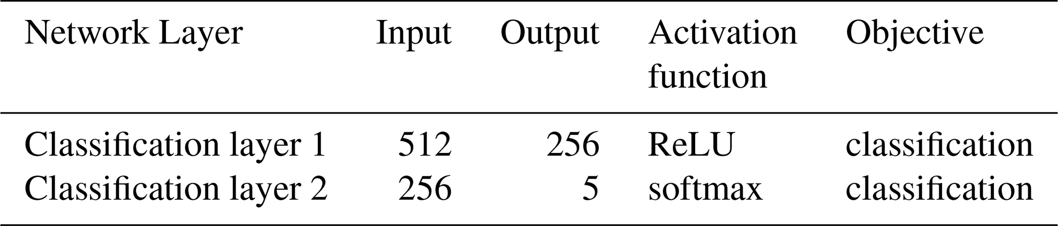 The specific parameter settings for the convolutional layer and the fully connected layer are shown in Tables 1 and 2. Convolutional layers use convolutional kernels to convolve local regions of input data, with each kernel using the same weights to extract local features of input information and share weights. The ReLU is used as the activation function of the convolutional layer, and the softmax is employed in the Classification layer 2 of the full connection layer.