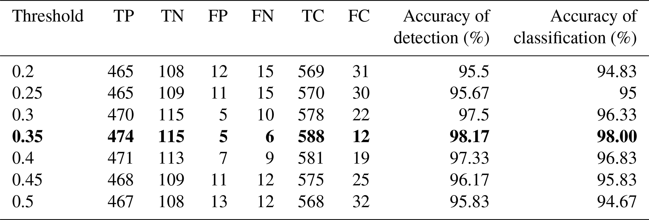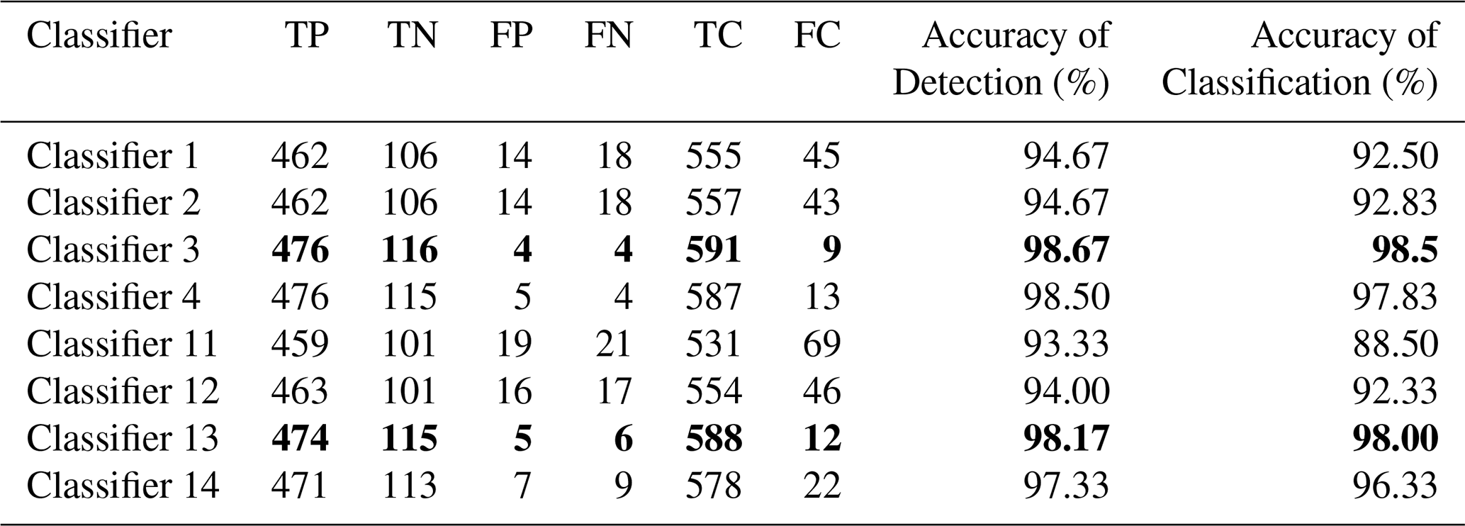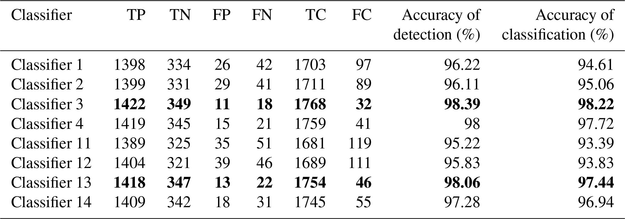 Furthermore, in order to evaluate the threshold, different values of γ with a step of 0.05 are checked based on Experiment 1. The values of γ are set to 0.2, 0.25, 0.3, 0.35, 0.4, 0.45, and 0.5. The corresponding results are illustrated in Table 5. This experiment is implemented based on Classifier 13 under the condition of the noisy environment.