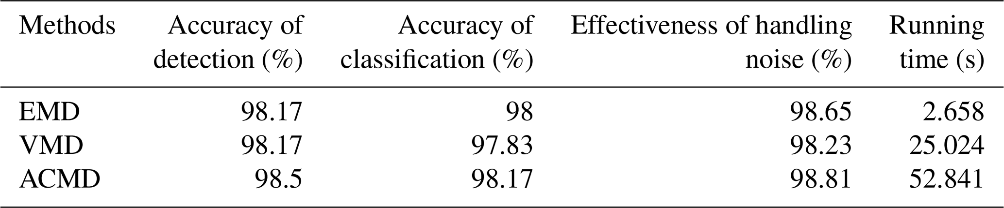 Based on Table 5, the best diagnosis results are obtained when the threshold γ is set to 0.35. Therefore, γ≥0.35 is employed in the diagnosis algorithm as shown in Table 3. Additionally, to compare the effectiveness of the employed EMD method, the latest VMD (Xia et al., 2025) and ACMD (Ding and Wang, 2022) are chosen to verify diagnosis performance. For the sake of fairness in comparison, it is worth noting that the threshold is set to the same value in the mode selection phase. The fault dynamics identification phase and the diagnostic model construction phase remain unchanged. Based on the proposed diagnosis model (i.e., Classifier 13 in the noisy environment), the diagnosis results with the signal decomposition of EMD, VMD, and ACMD are presented in Table 6. The effectiveness of handling noise presents the correlation degree between the reconstructed signal and the original.