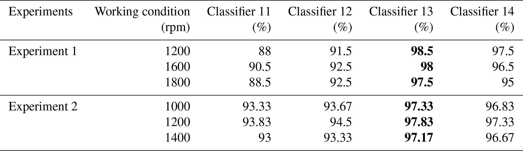 Table 4Diagnosis results of rotor rub-impact faults based on Experiment 1. The values in bold denote the experiment results of the proposed method.