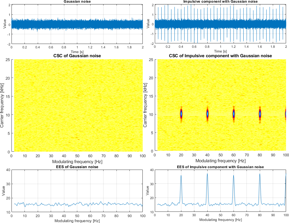 where ϵ is the cycle frequency and is the autocovariance function of time series {Xt}. In this application, f can be understood as the carrier frequency and ϵ as the modulating frequency, both expressed in Hz. SX(f,ϵ) is estimated using averaged cyclic periodogram (ACP) (Antoni, 2007).