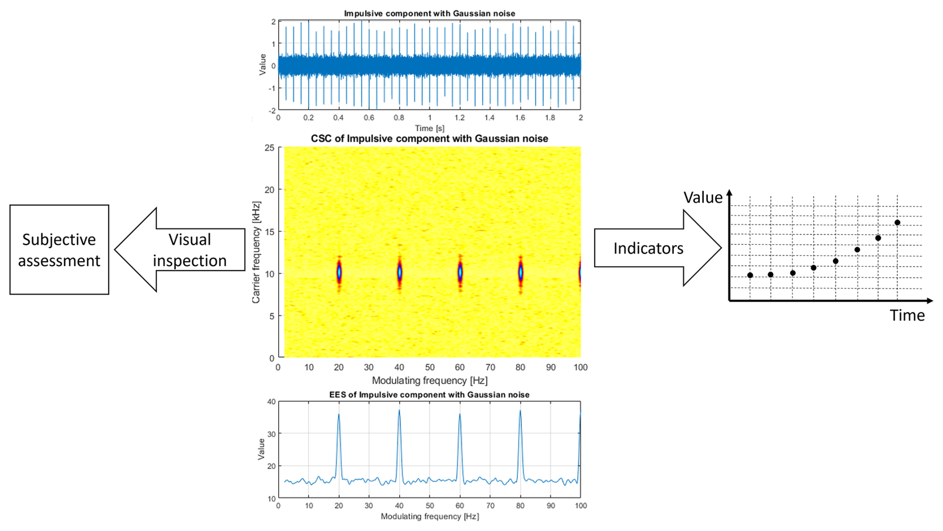The bi-frequency map enables us to obtain two types of information: the modulating frequency (related to the cycle between impulses) and the carrier frequency associated with the natural frequency excited and modulated by periodic impulses. In the case shown in Fig. 1, modulating frequency is 20 Hz and the carrier frequency is 10 kHz. The bi-frequency map can be visually inspected, integrated into the envelope spectrum (Randall and Antoni, 2011; Mauricio et al., 2020), or serve as a basis for a novel scalar indicator that can be further monitored and used for prognosis, as shown in Fig. 2. In practical situations, visual inspection is rather difficult, subjective, time-consuming, and cannot be performed automatically. The most popular approach involves integrating the map into a one-dimensional vector, interpreted as an envelope spectrum. Unfortunately, such integration may lead to the accumulation of noise or other cyclic components in the case of a complex multicyclic signal. In the condition-monitoring system, the envelope should be further integrated to forecast the remaining useful life. Such a scalar indicator could be extracted directly from the map; however, it requires a precise understanding of all the components that exist in the map.