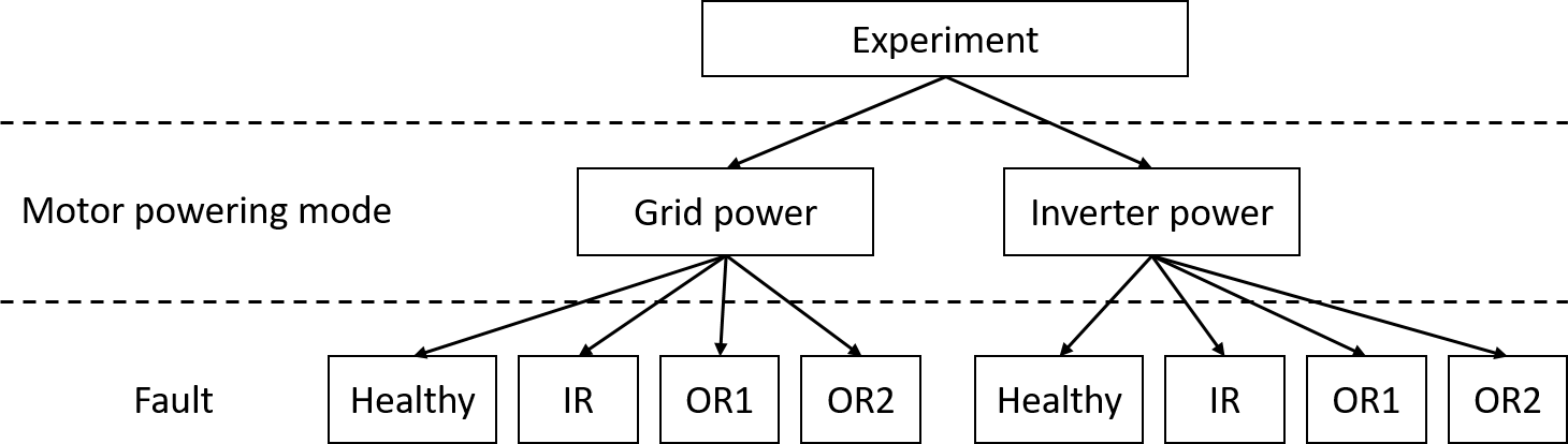 Several experiments have been carried out. They can be divided according to the presence of the fault (healthy, faulty), the type of fault (inner, outer), the size of the fault (no fault, small fault, large fault), and the power supply (direct grid, inverter). These variants are summarized in Fig. 6.
