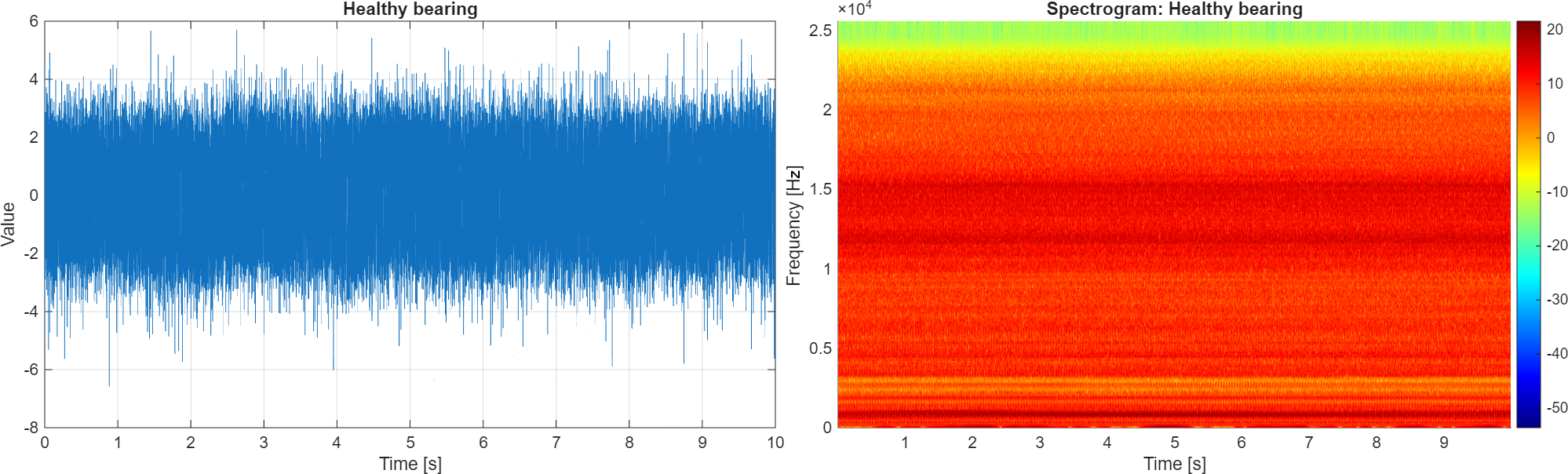 In Fig. 7, the vibration signal and its spectrogram of bearings in healthy conditions are presented. It is worth noting the amplitude of the time series (which will increase for faulty cases because of the presence of impulses) and the rich and rather uniform structure of the spectral content (no dominant resonance).