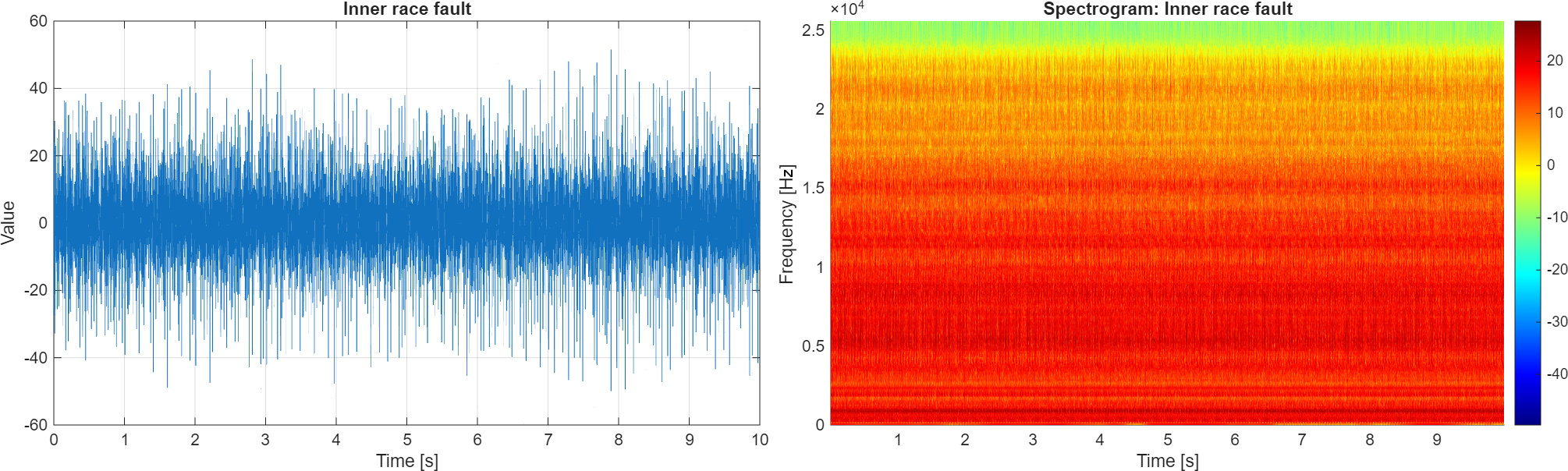 In Fig. 8, the vibration signal and its spectrogram related to a faulty bearing with an inner ring fault are presented. It is evident that the introduced fault caused a significant increase in the signal amplitudes (left panel) and a change in the spectral structure. The resonance area is visible around 5 kHz.