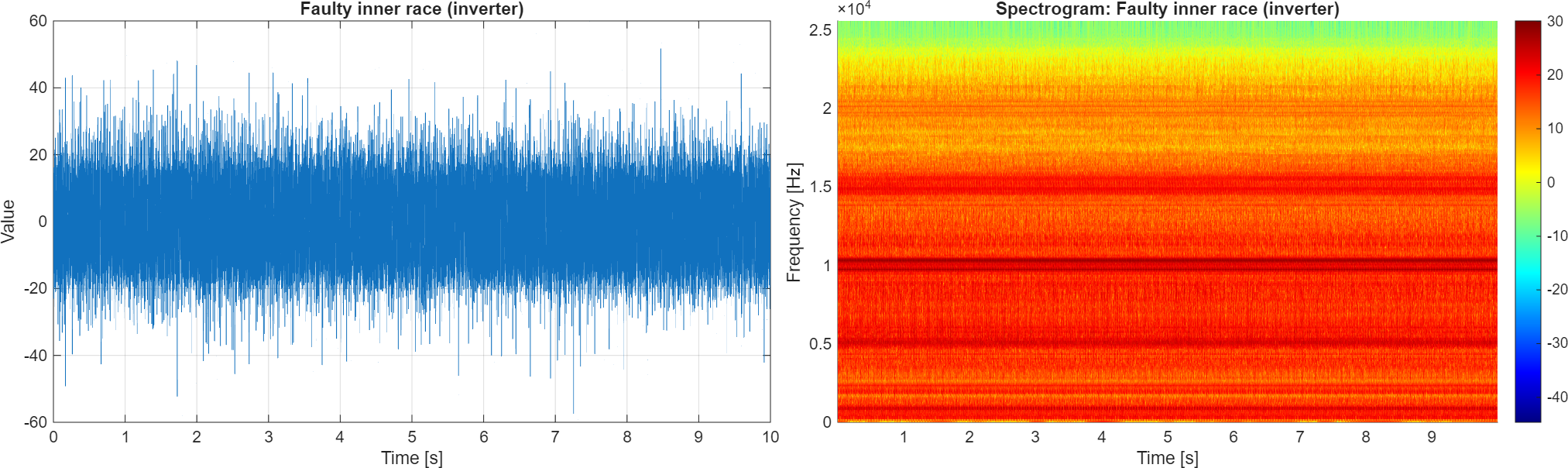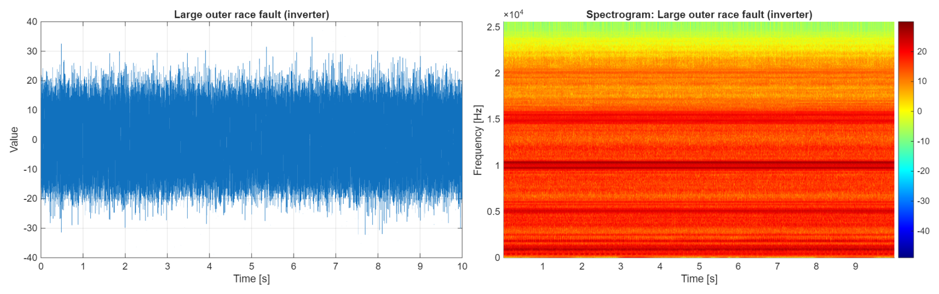 In Fig. 12, the vibration signal and its spectrogram are presented. These are related to a bearing that is faulty with a fault of the inner ring. It is worth noting that the introduced fault caused a significant increase in amplitudes of the signal (left panel) and a change in the spectral structure (in comparison to a healthy motor driven by an inverter, as well as a healthy motor powered by an electric grid). The resonance area is barely visible around 5 kHz.