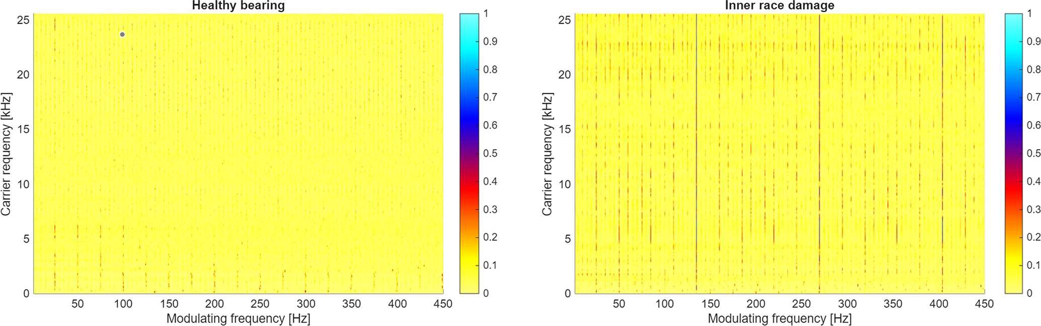 Figure 17 presents CSC maps calculated based on signals from a healthy bearing (panel a) and from a bearing with an inner race fault (panel b). The signal from the healthy bearing contains one major component visible on the map: a cycle of 24.97 Hz and its multiples. This component describes the rotational frequency of the motor shaft.