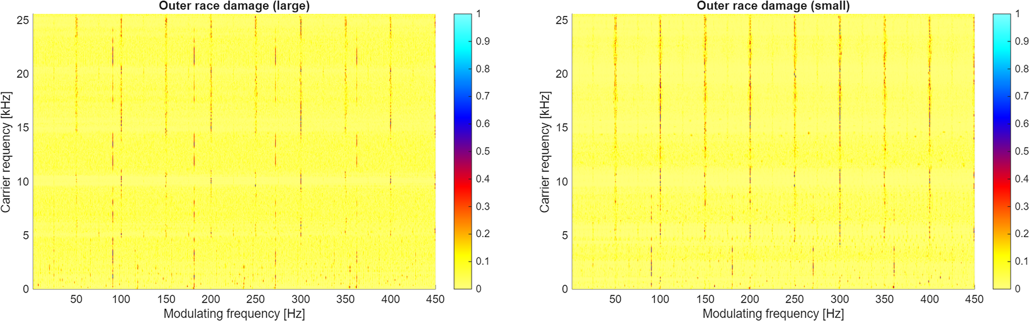 Figure 18 presents CSC maps calculated based on signals from bearings with large (panel a) and small (panel b) outer race faults. On both maps, the predominant component describes the 89.5 Hz cycle (and its multiples) that correctly describes the characteristic frequency of the outer race fault. The main difference between those two faults is clearly visible on the maps. It manifests mainly as a difference in the carrier frequency band occupied by the fringes describing the fault component. The value of the fringes also differs and is stronger for the larger fault.