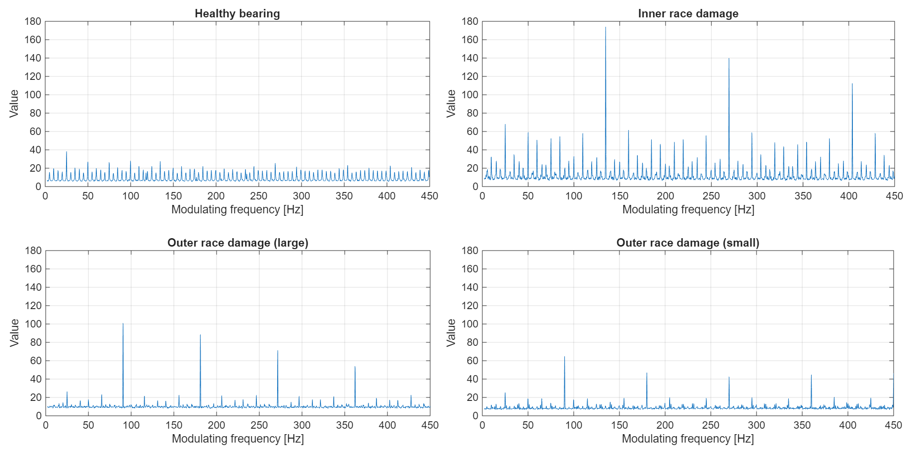 In Fig. 25, a basic feature is presented that accumulates all the information into one value. One can see that introducing a fault in the bearing causes an increase in amplitudes on the map, indicating that the value of the feature is higher than in a healthy state. A small outer race fault provides a relatively small increase in the value of the feature. It is worth noting that even under good conditions, there are many components with relatively small amplitudes (related to the shaft and others), so their accumulation results in relatively high background noise.