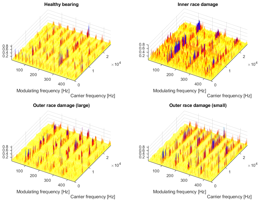 Searching for impulsiveness in the time domain or periodic structure in the envelope spectrum are two main directions for bearing diagnostics. However, it has been found that signals from faulty bearings can be considered a special class of nonstationary signals with some cyclic variation in signal properties. Antoni et al. (2004) proposed a framework for cyclostationary modeling for vibration signals. Cyclostationary methods are well-known in other fields, such as telecommunications and oceanography, and can be successfully applied to condition monitoring. It is recommended to read the recent book on trends and applications in cyclostationary analysis of Napolitano (2016). Randall et al. (2001) showed that integrated cyclic spectral correlation integrated over all carrier frequency bins is equal to the amplitude spectrum of the squared envelope of the signal. Raad et al. (2008) proposed indicators of cyclostationary behavior that could be used for condition monitoring. Further work by Antoni (2009) highlighted the practical benefits of using a cyclostationary approach for bearing diagnostics.