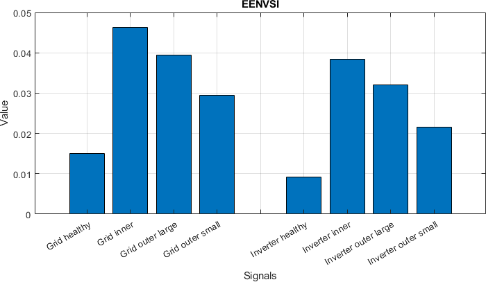 Signals describing inverter-powered cases produce lower values of EENVSI than for grid-powered cases. Since EENVSI (as well as ENVSI) is conceptually equivalent to SNR but for envelope spectra instead of signals, one can conclude that this is further evidence that an inverter-powered scenario produces signals more contaminated with spectral components not related to the faults.