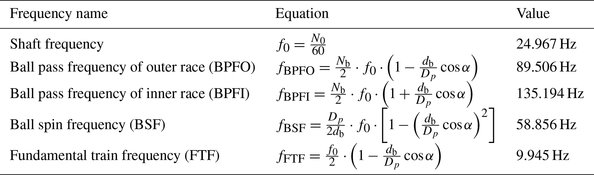 Table 2Characteristic frequencies of rolling element bearings. N0 – shaft speed (rpm), f0 – shaft frequency (Hz), Nb – number of rolling elements balls or rollers), db – ball/roller diameter, Db – pitch diameter (center-to-center distance of rolling elements), α – contact angle.