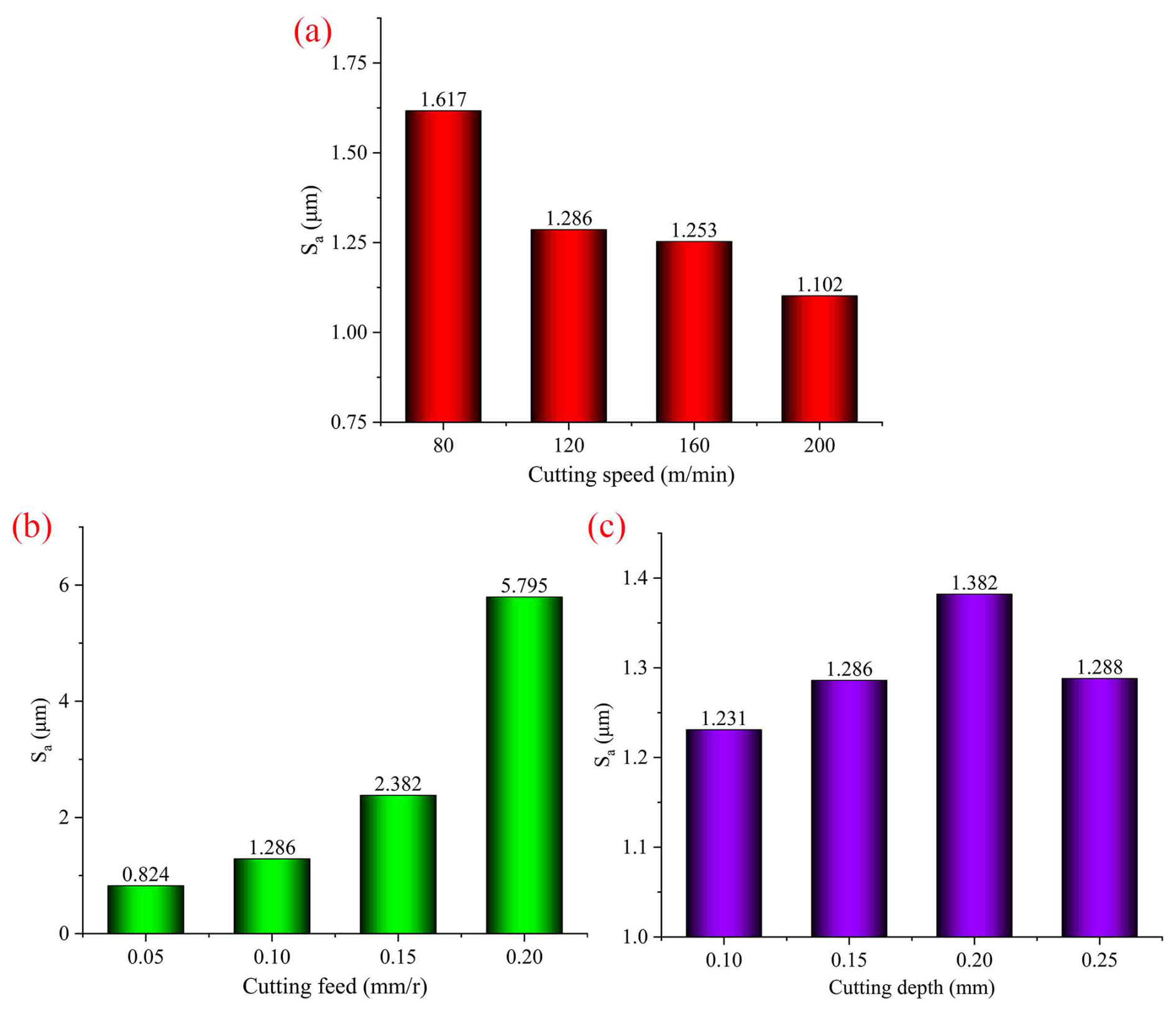 The turning speed promoted the improvement in surface accuracy of the workpiece (Lima et al., 2005), as shown in Fig. 3a. When the turning speed during hard turning of the AISI M2 workpiece was 80 m min−1, its surface accuracy was the lowest, and the value of Sa was 1.617 µm. When the turning speed during hard turning of AISI M2 was 200 m min−1, the workpiece achieved the highest surface accuracy, and its Sa value was 1.102 µm. A high turning speed generates more cutting heat. The surface of the AISI M2 workpiece was softened by the high cutting heat generated during hard turning, so the cutting force during machining decreased, thus improving the machining accuracy of the workpiece surface. Turning feed is the primary factor affecting the surface accuracy of the workpiece (Dureja et al., 2009). As illustrated in Fig. 3b, the improvement in turning feed during hard turning of AISI M2 significantly reduced its surface accuracy. When the turning feed during hard turning of AISI M2 was changed from 0.05 to 0.2 mm r−1, its Sa increased from 0.824 to 5.795 µm. The increase in turning feed not only leads to the increase in the microscopic residual height on the surface of the workpiece but also increases the cutting force (Bartarya and Choudhury, 2012), which makes the workpiece vibrate during machining. Turning depth had little influence on the surface accuracy of the AISI M2 workpiece, and Sa firstly increased and then decreased, as shown in Fig. 3c. When the turning depth during hard turning of AISI M2 was 0.1 mm, its Sa was 1.231 µm, and the surface accuracy was the highest. When the turning depth during hard turning of AISI M2 was 0.2 mm, the surface roughness of the machined surface was the worst, and its value Sa was 1.382 µm.