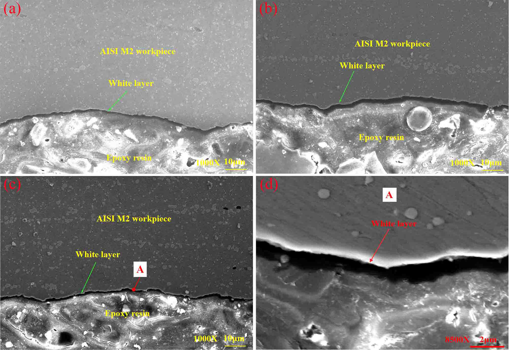 A metamorphic layer is produced on the machined surface of the workpiece under severe thermal–mechanical combined load. The metamorphic layer is a white layer between 0.1 and 100 µm. The white layer has excellent corrosion resistance, high hardness, and high brittleness, and there are random microcracks in it. The white layer formation fundamentally depends on the thermal and mechanical effects experienced by the workpiece material during machining. A high machining speed usually causes a high deformation rate of the material in the machining shear zone, thus generating massive cutting heat and transferring it to the workpiece. The gradual wear of the tool intensifies the friction between it and the workpiece, thus increasing the heat output and shear distortion on the surface of the workpiece.