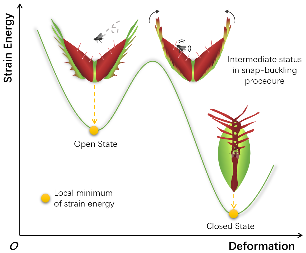From the energy aspect, the variation in strain energy contained in the trap lobes during rapid closure is presented in Fig. 4. The open and closed states of the curved lobes correspond to two local minima of strain energy, which are unequal in magnitude. The relatively lower strain energy at the closed state facilitates rapid closure, whereas the higher strain energy of the open state accounts for the longer reopening period due to the slow accumulation of a larger stored strain energy (Zeng et al., 2025).