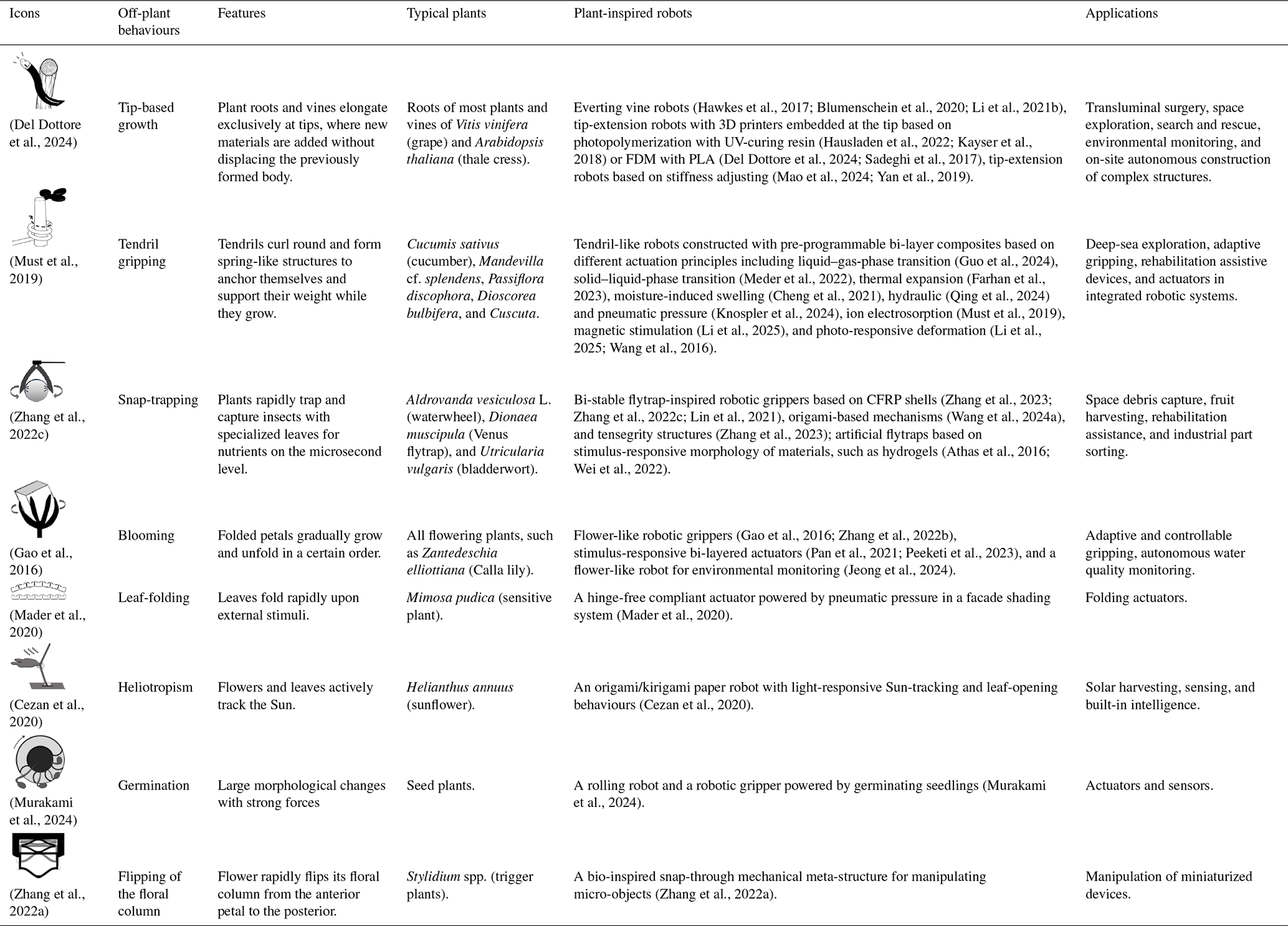 A plant generally functions as a monolithic mechanism throughout most of its lifetime until the seeding stage, as indicated in Fig. 1. Its primary functions are achieved either through growth, which is driven by cell proliferation and osmotic actuation (Forterre, 2013; Cosgrove, 2005), or through elastic deformations of flexural structures. On-plant behaviours refer to movements and responses exhibited by each plant as a whole organism. Typical examples include growth, gripping, and trapping behaviours, as well as other motion strategies. A detailed discussion on these behaviours and their corresponding plant-inspired robots is provided in the following sub-sections, and they are summarized in the summary sub-section.