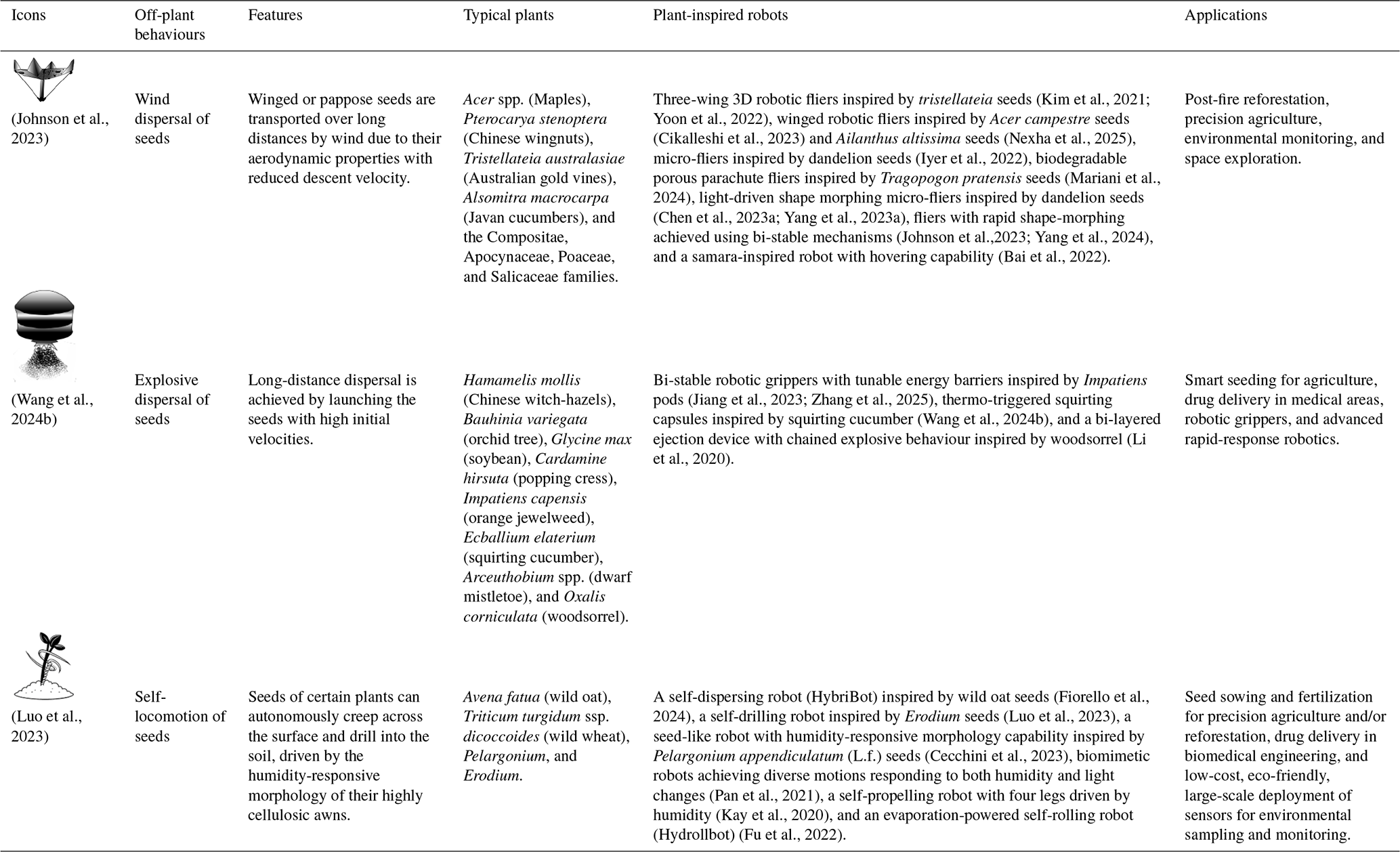 In this review, we focus specifically on three seed dispersal strategies: wind-aided dispersal (anemochory), explosive dispersal (ballochory), and autonomous on-ground movements of dispersed seeds (herpochory). In these cases, seeds and/or parent plants exhibit distinctive dynamic off-plant behaviours in various forms. For emphasizing their dynamic characteristics, these three seed dispersal strategies are schematically illustrated in Fig. 5 using three representative plant examples. Furthermore, they are correspondingly symbolized with three types of soldiers (i.e. paratroopers, artillery soldiers, and infantry soldiers, respectively) by analogy to facilitate intuitive understanding. These seed dispersal strategies offer both conceptual and structural inspiration for the development of advanced plant-inspired robots, which are introduced in the following sub-sections and are summarized in the last summary sub-section.