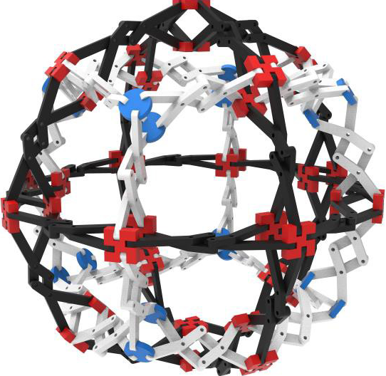 By further connecting 16 quadrangular-element groups in specific parallel and perpendicular configurations and incorporating 8 triangular-element groups at the interstitial positions of the quadrangular framework, a spatial framework for a polyhedral spherical shell can be constructed. As illustrated in Fig. 5, the three-dimensional model demonstrates the polyhedral-spherical-shell mechanism in its deployed state. Figure 5 shows the three-dimensional model of the polyhedral-spherical-shell mechanism in the unfolded state.