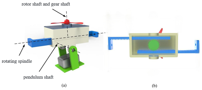 a hybrid actuation system combining pendulum propulsion with rotor-assisted stabilization and gear–rack-based deformation;
