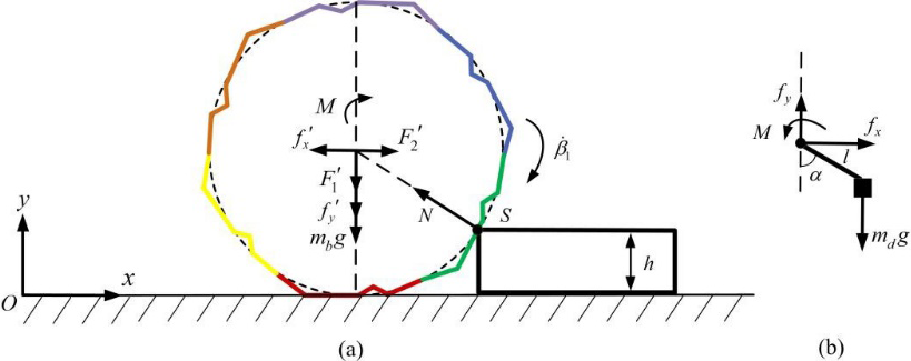 The force equilibrium of the polyhedral shell was established by applying the Newton–Euler method under the no-slip assumption. Taking moments about the obstacle contact point leads to the following kinematic relationship: