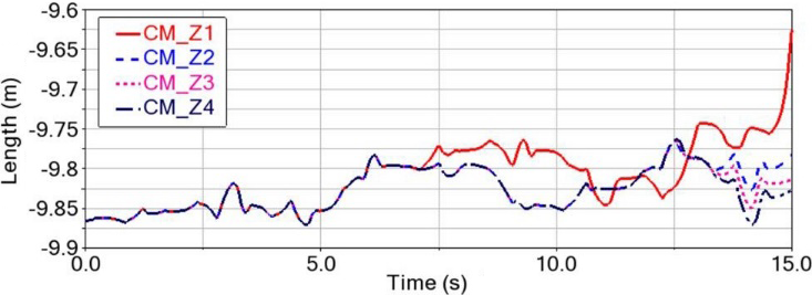 Figure 17 presents the post-processed simulation results for z-axis displacement. From the Z1 curve, it is observed that, during the first 2.5 s of motion, no significant displacement along the z axis occurs. Between 2.5 and 5 s, a self-correctable drift takes place, and, by 5 s, the trajectory closely aligns with the desired path. However, from 5 to 7.5 s, the z-axis displacement increases rapidly and continues to grow until 10 s. Although the trajectory partially self-corrects from 2.5 to 12.5 s, the robot is no longer able to maintain stable straight-line motion thereafter, and a sharp increase in z-axis drift is observed at 15 s.
