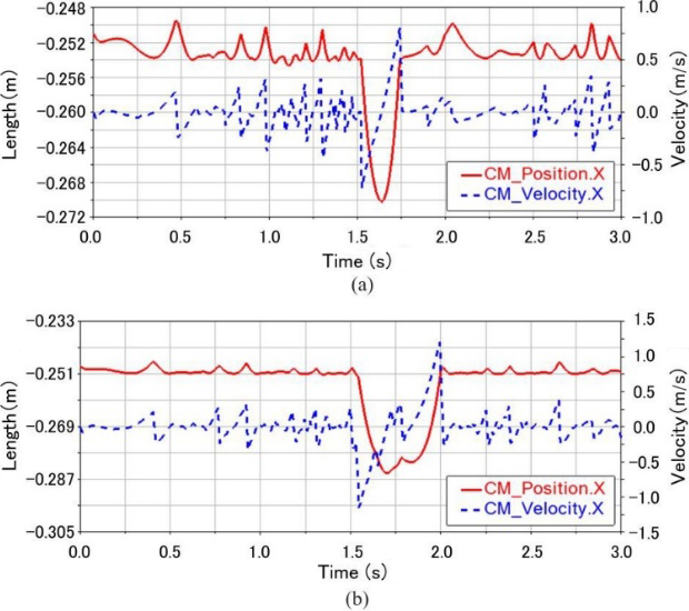 Through the analysis of the above-mentioned simulation results, the main influencing factors of the obstacle-crossing height and obstacle-crossing stability of the RPSR can be found. Following this, it is necessary to analyze the obstacle-crossing adaptability. Under the condition that other parameters remain unchanged, the height of the obstacle is set to 0.03 m, and the simulation result of the component of the motion trajectory of the polyhedral spherical robot on the x axis is shown in Fig. 21a.