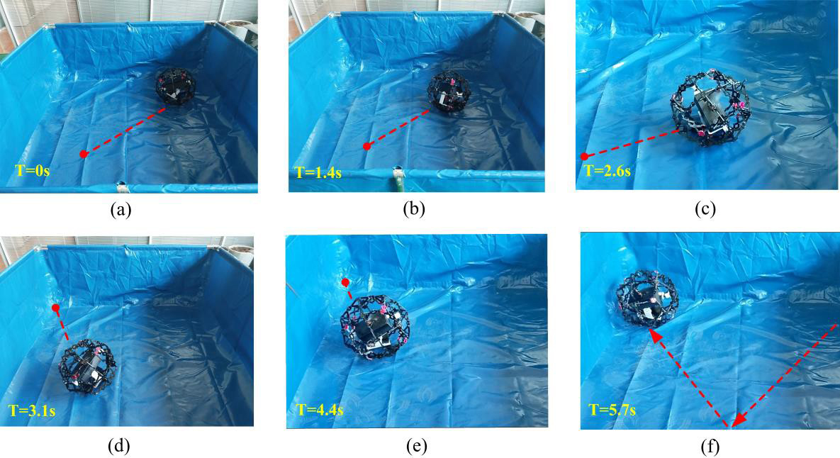 The steering-motion experiment of the RPSR is shown in Fig. 25. At T = 0 s, the robot starts to roll along the dotted-line direction from a stationary state. At T = 1.4 s, it continues to move in a straight line. To test the influence of the rotor mechanism on the motion, when it travels to T = 2.6 s, the brushless motor is controlled to rotate clockwise at a high speed. The polyhedral spherical shell instantaneously contracts slightly and remains stable. At the same time, the entire robot rotates slightly in the direction opposite to the motor rotation. At T = 3.1 s, the servo is controlled to make the pendulum swing around the direction of the rotating main shaft, and the moving direction of the robot changes. At T = 4.4 s, the robot maintains a straight-rolling state. At T = 5.7 s, when it approaches the edge of the experimental field, the robot and the rotor mechanism stop moving.