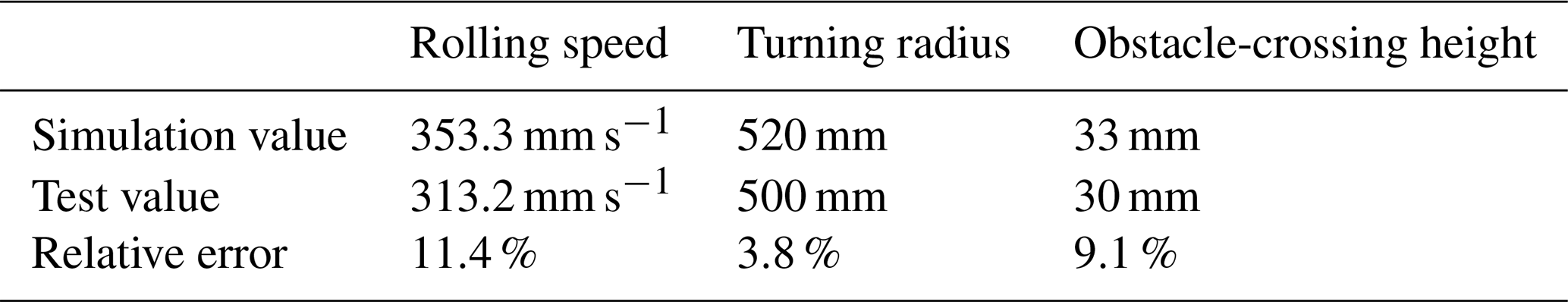 Based on the theoretical values, using the simulation values of the motion performance of the RPSR in Sect. 3, the relative error between the simulation values and the test values is calculated based on the test values. The radius of the robot is 250 mm, and the comparison of the robot's motion performance parameters is shown in Table 2.