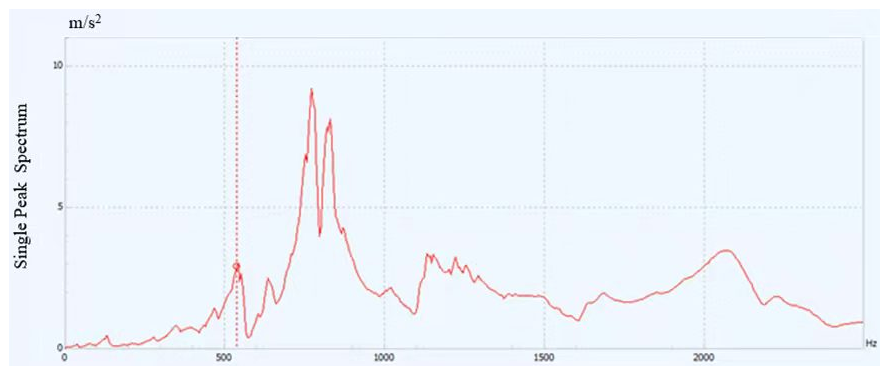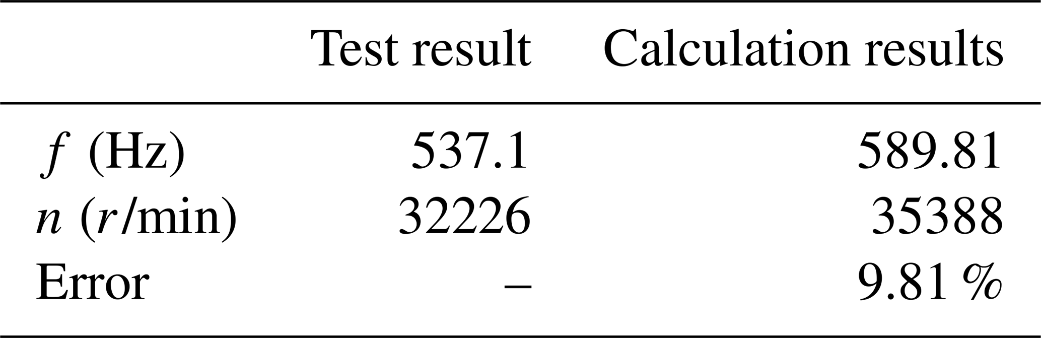 It can be seen from Fig. 4 that the first peak appears at 537.1 Hz, which could be judged as the first natural frequency of the system. The first critical speed can be calculated according to the formula n=60f. Table 1 shows the comparison between the calculated results and the experimental results.