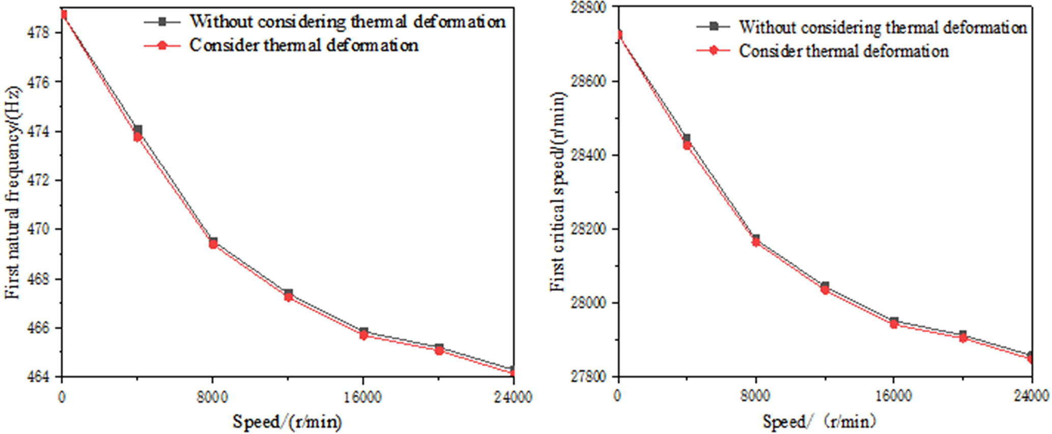 When the motorized spindle rotates at high speed, the friction of the ACBB leads to an increase in the temperature and heat generation in the internal parts. This causes the thermal deformation of the ACBB and affects the dynamic characteristics of the system. Figure 6 shows the variation of the natural frequency and critical speed of the system when considering the thermal deformation of the ACBB at different speeds. It can be seen from Fig. 6 that the natural frequency and critical speed of the system are reduced when considering thermal deformation. This shows that the influence of thermal deformation on the dynamic characteristics of the ACBB should be considered when establishing a dynamic model of ball bearings, and the thermal deformation of the ACBB should be reduced as much as possible.