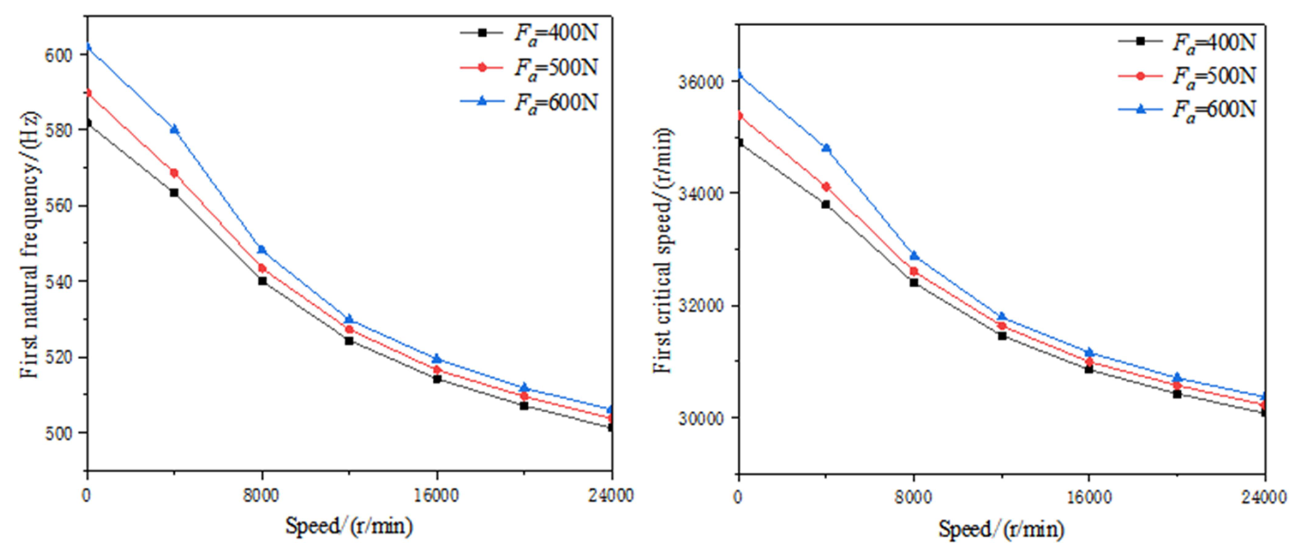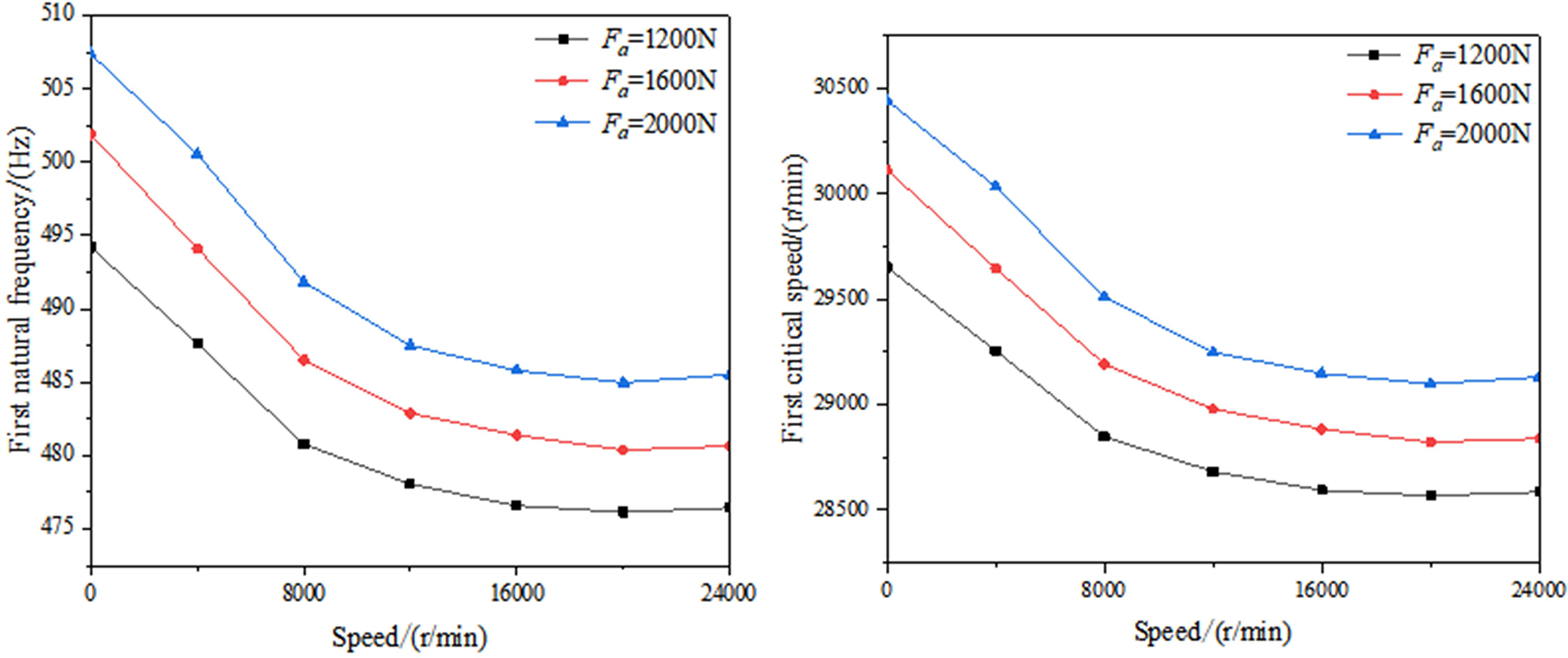 When the ACBB preload Fa =500 N, the natural frequency and critical speed of the motorized spindle system at different ACBB speeds are given in Fig. 5. With the increase in the speed of the motorized spindle, the natural frequency and critical speed of the system show a downward trend. This is because the contact stiffness and film stiffness are in the same order of magnitude and decrease, and the comprehensive stiffness of the ACBB decreases under the action of the series, which results in a downward trend in the natural frequency and critical speed of the system.