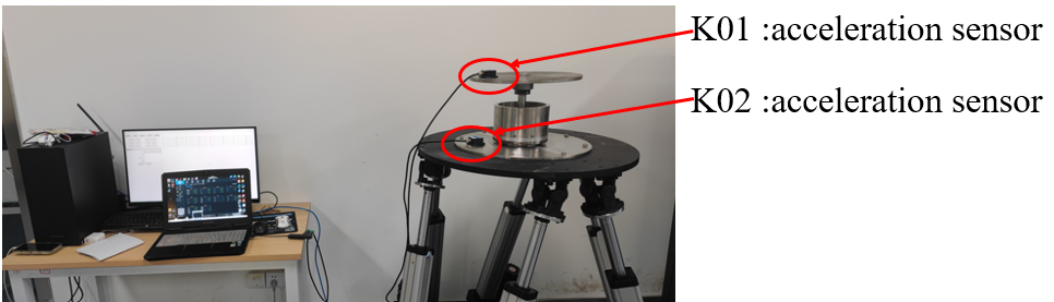 As shown in Fig. 6, the experimental apparatus was installed on the moving platform of a 6-degrees-of-freedom vibration table. The sensors transmitted 485 signals to the computer. Each frequency excitation was maintained for 30 s, during which the z-axis acceleration values from sensors K01 and K02 were recorded. The experiment was repeated multiple times, and the average values were calculated.