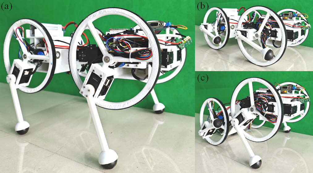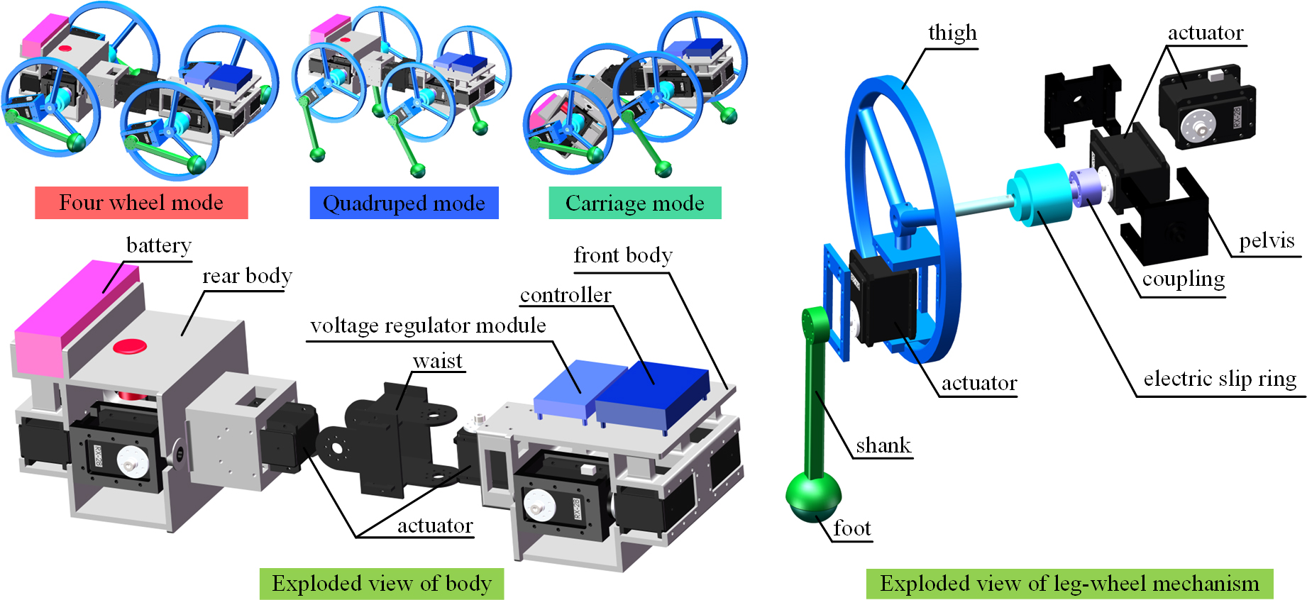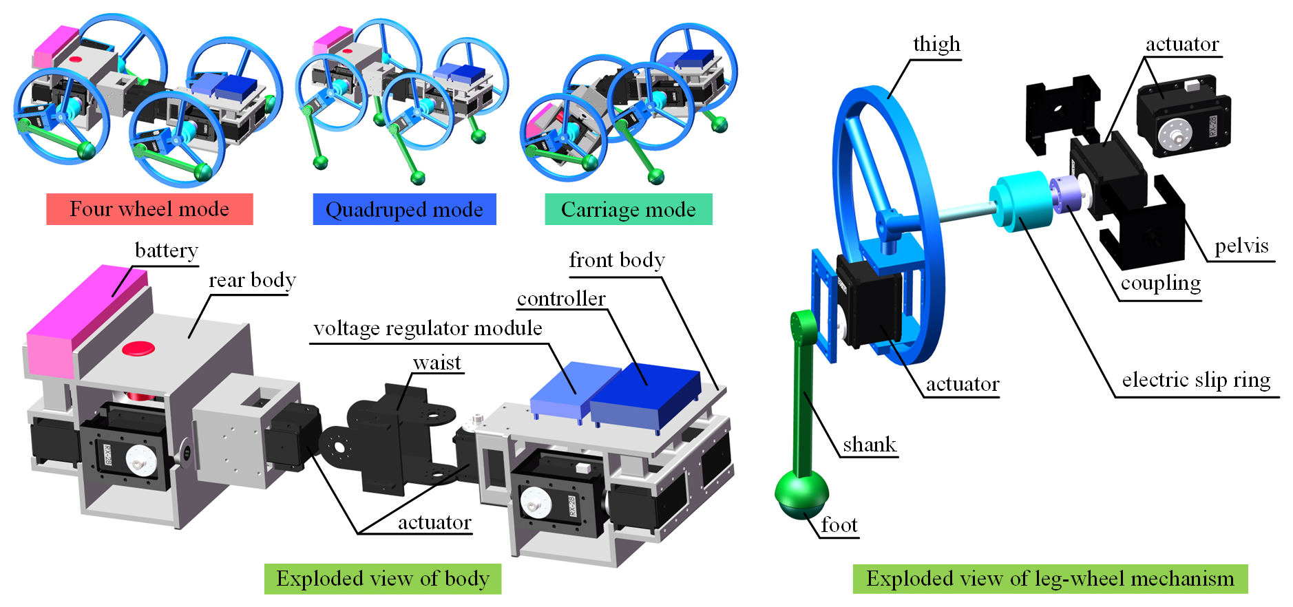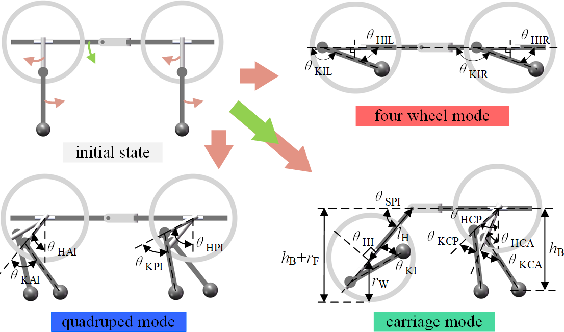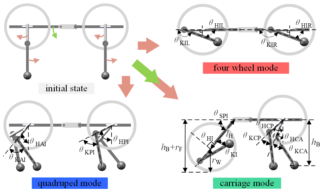 The locomotion of the robot in three modes – four wheel, quadruped, and carriage mode – is planned, along with the transition methods between these modes.