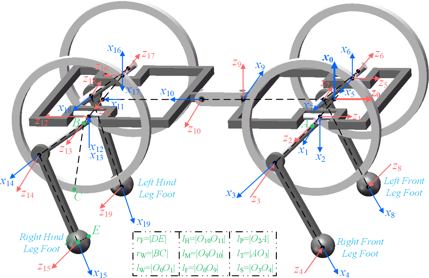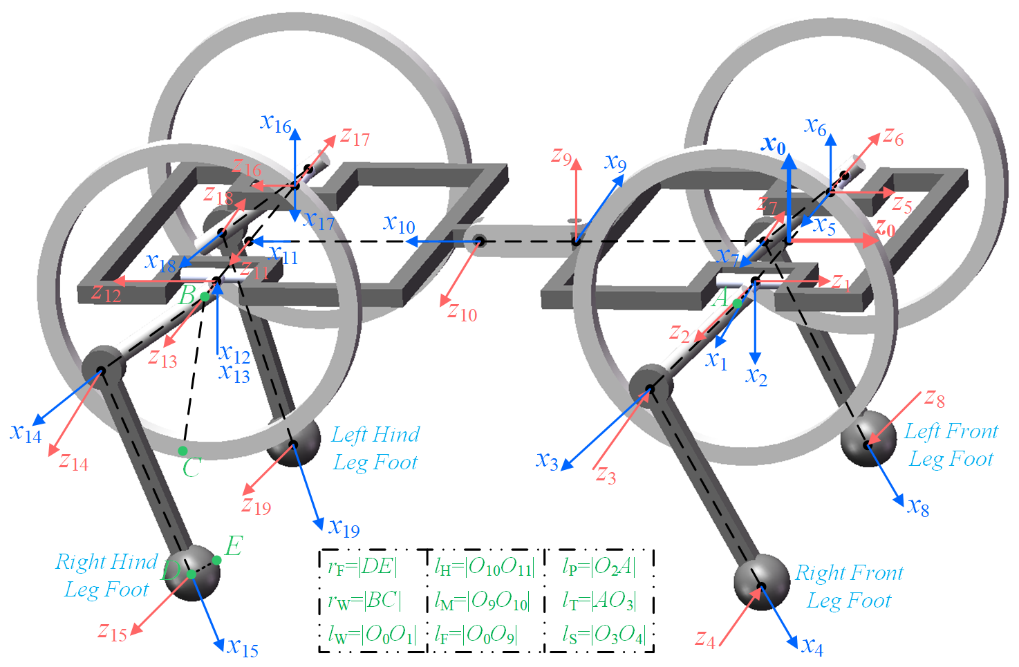 According to the parameters in Table 2, the x, y, and z coordinates of the leg foot ends are expressed in the base frame (frame 0) and are calculated using homogeneous transformation matrices. The position of the front leg foot end can be solved as follows: