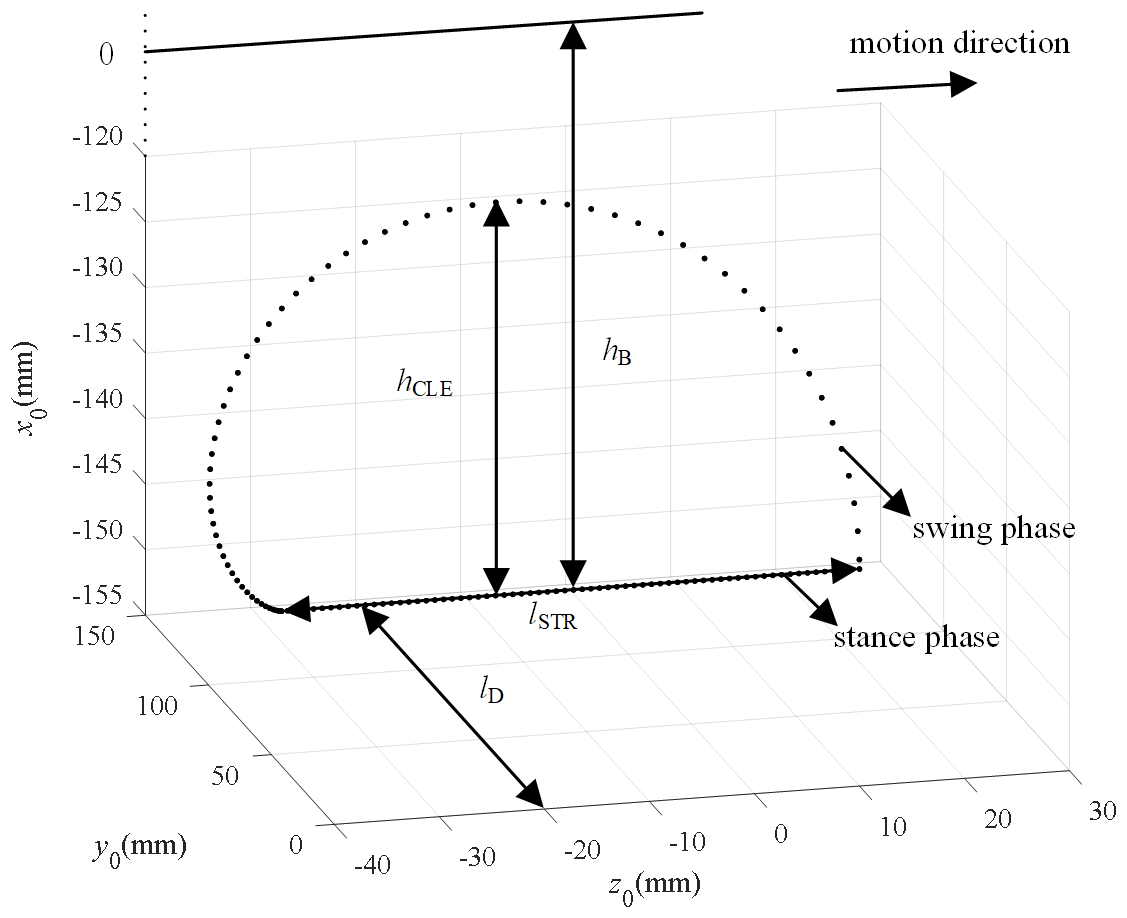 where lSTR denotes the stride length, hCLE denotes the foot end lift height during the swing phase, hB denotes the body height, t denotes time, TL denotes the gait cycle, and TSW denotes the swing phase duration. k3 is a parameter indicating fore or hind legs, with 0 for fore and 1 for hind, and k4 indicates left or right legs, with 1 for right and −1 for left. When TL = 0.4 s, TSW = 0.2 s, lSTR = 55 mm, hCLE = 30 mm, hB = 155 mm, and lD = 146 mm, the foot end trajectory of the right foreleg is as shown in Fig. 4. In this paper, a trot gait is adopted for quadruped locomotion; thus, the speed of quadruped motion can be calculated as