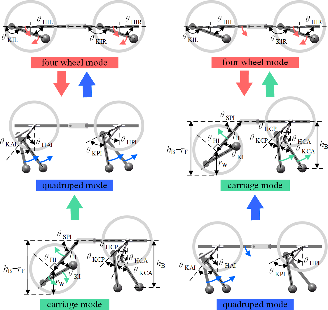 The schematic diagram of transitions between different locomotion modes is shown in Fig. 6. From four-wheel mode to quadruped mode, the postures of all four leg-wheel mechanisms must be altered. To ensure a smooth transition, the four wheels are first synchronized, and the thighs are oriented backward, and then the thighs are driven downward while the shanks are lowered. During the transition, the robot's COG remains near the center of the support polygon so that a joint space planning method is directly applied to drive each joint to its target position. From four-wheel mode to carriage mode, only the postures of the front leg-wheel mechanisms and the waist pitch joint angle need to be changed. First, to minimize motion discrepancies among the front legs, the front leg wheels are synchronized with the thighs pointing backward. Subsequently, the waist pitch joint and the front leg-wheel joints are simultaneously driven to their target positions.