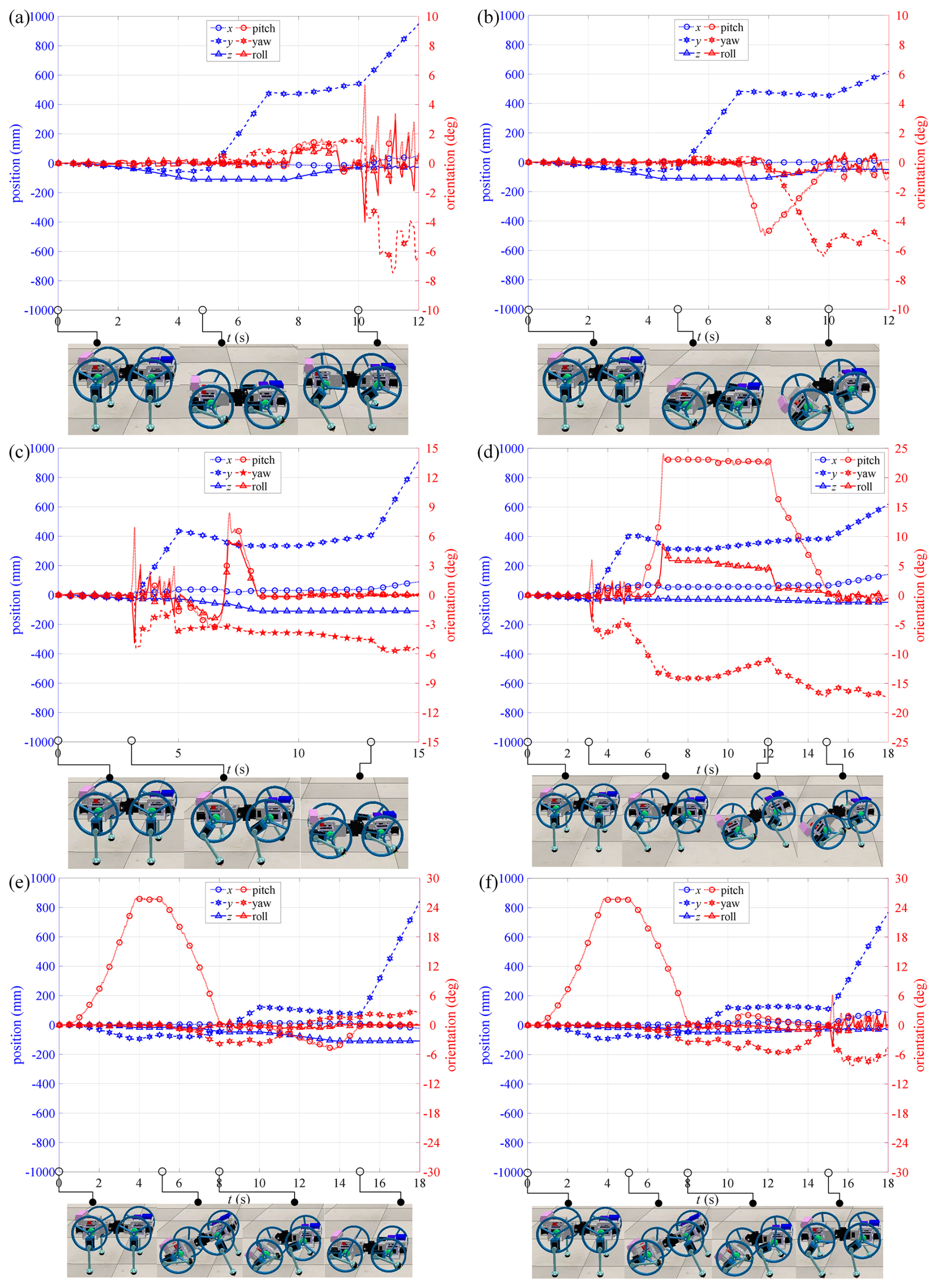 Figure 7Simulation snapshots and position–orientation curves of the front body: initial state to four-wheel mode and quadruped mode (a), initial state to four-wheel mode and carriage mode (b), initial state to quadruped mode and four-wheel mode (c), initial state to quadruped mode and carriage mode (d), initial state to carriage mode and four-wheel mode (e), and initial state to carriage mode and quadruped mode (f).