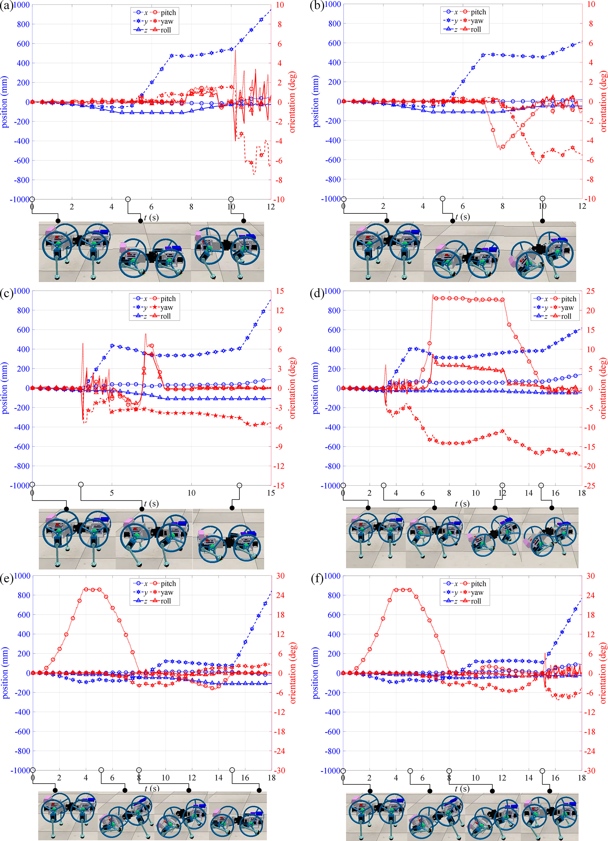 The entire motion process is divided into four stages: initial state to four-wheel mode, four-wheel locomotion, transition from four-wheel mode to quadruped mode, and quadruped locomotion. Simulation snapshots and the position–orientation variations during motion are shown in Fig. 7a. Position and orientation data are taken from the front body, with the positive z axis pointing vertically upward, the positive y axis pointing in the forward direction, and the positive x axis pointing to the robot's right. During 0–5 s, the robot transforms from the initial posture to wheel mode; body height decreases, and the robot moves slightly backward, while other data remain essentially unchanged, indicating a stable transformation. During 5–7 s, four-wheel locomotion is executed; displacement along the forward direction increases, while other data remain almost constant. Throughout four-wheel motion, the wheel speed is 0.5 rpm, yielding a theoretical velocity of 275 mm s−1 according to Eq. (6). Using forward-displacement data divided by elapsed time, the actual velocity is calculated to be approximately 259 mm s−1, slightly lower than the theoretical value due to a minor yaw deviation of about 1°. During 7–10 s, the robot transitions from four-wheel mode to quadruped mode; body height increases. Friction between the foot ends and the ground causes small variations in pitch, yaw, and roll angles. During 10–12 s, quadruped locomotion is performed with a gait period of 0.4 s, a stride length of 55 mm, a foot end trajectory height of 30 mm, and a body height of 155 mm. According to Eq. (8), the theoretical velocity is 275 mm s−1. During motion, forward displacement increases; pitch, yaw, and roll angles vary periodically with the gait cycle, and lateral displacement increases due to lack of balance control, causing oscillations and deviations. Using forward displacement divided by elapsed time, the actual velocity is approximately 229 mm s−1, which is lower than the theoretical value. This discrepancy is mainly attributed to the robot's yaw angle, as well as to contact impacts and local slipping occurring at the foot–ground interface.