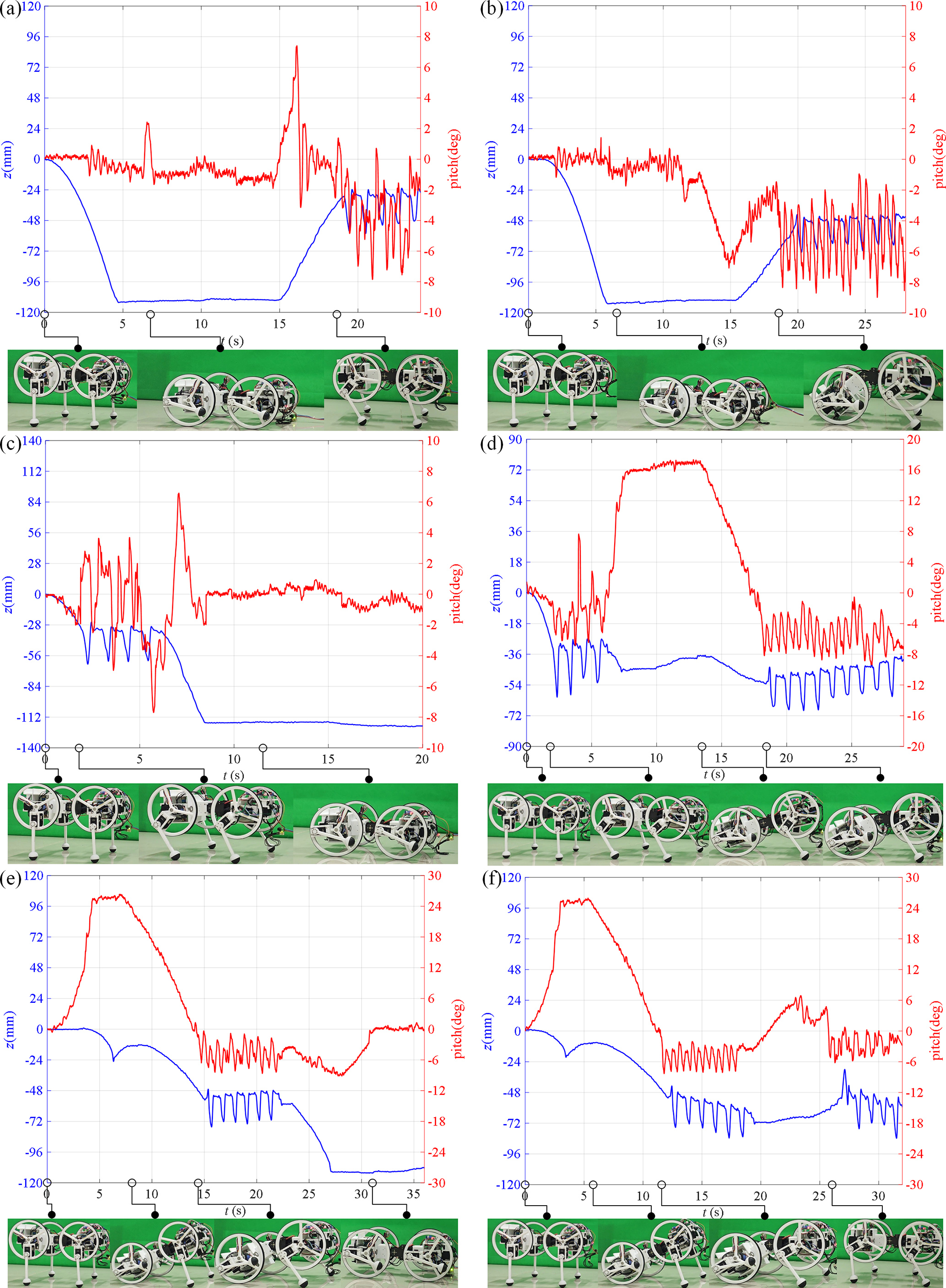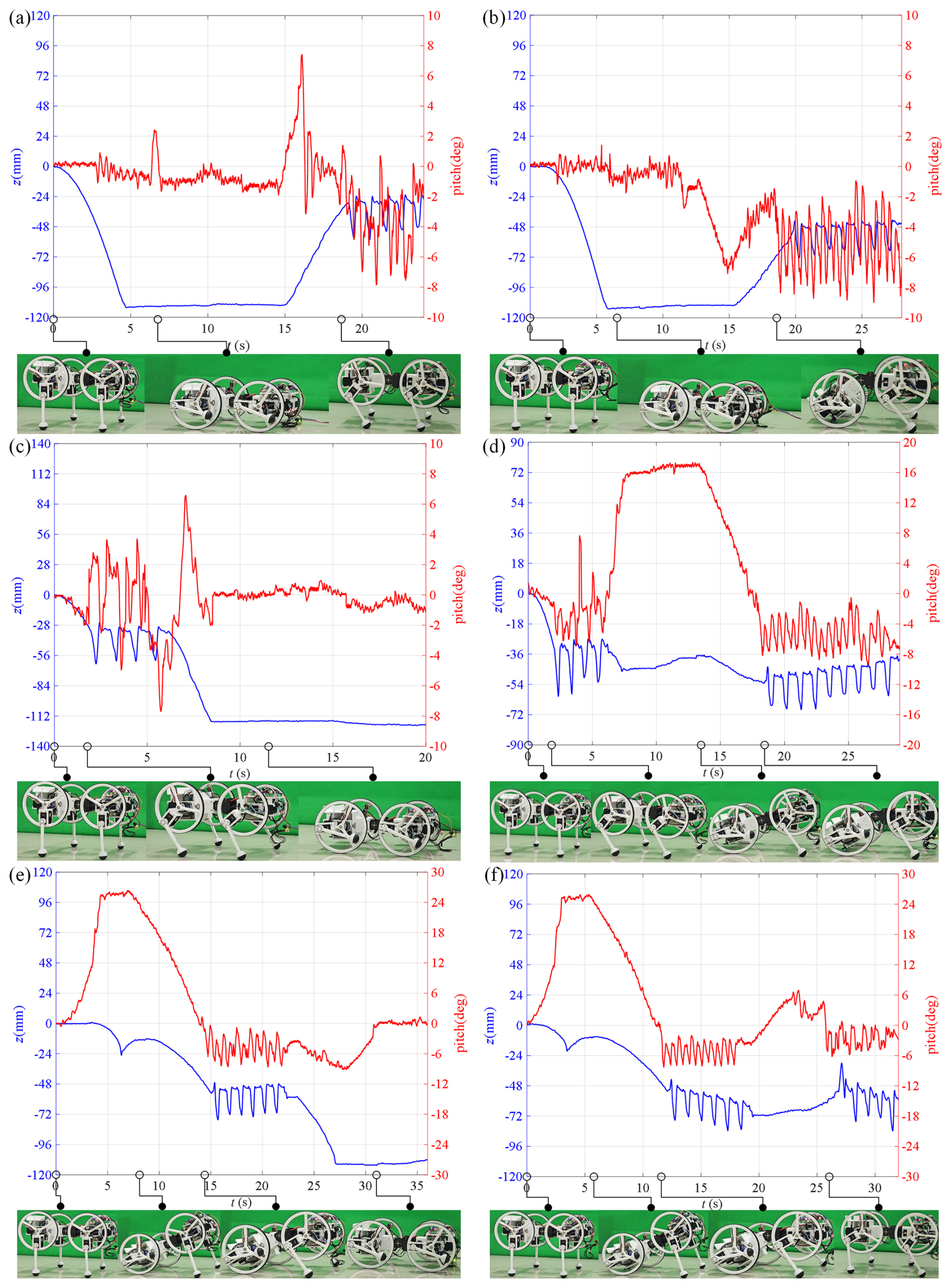 Figure 8Experimental snapshots and curves of front body height and pitch angle: initial state to four-wheel mode and quadruped mode (a), initial state to four-wheel mode and carriage mode (b), initial state to quadruped mode and four-wheel mode (c), initial state to quadruped mode and carriage mode (d), initial state to carriage mode and four-wheel mode (e), and initial state to carriage mode and quadruped mode (f).