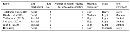 Furthermore, Peng et al. (2025) employ a sophisticated linkage and actuator suite to realize multiple locomotion modes – circular wheel, spoke wheel, and articulated leg – and can switch among them. To fully exploit the advantages of legged locomotion, this paper proposes DTransleg, a transformable leg-wheel quadruped designed with a serial articulated-leg architecture, as illustrated in Fig. 1. By reconfiguring the thigh link into a circular rim, DTransleg introduces wheeled motion without additional actuators or complex transmissions, yielding both a simpler structure and a more straightforward morphing process than comparable state-of-the-art platforms. A comparison between DTransleg and several typical leg-wheel robots with transformable leg-wheel mechanisms is presented in Table 1. Although the model of Okada et al. (2012) appears to be structurally similar, the underlying philosophy differs: PEOPLER-II embeds limited leg-like motion into a wheeled system, resulting in gaits that more closely resemble spoke-wheel locomotion. In contrast, DTransleg prioritizes full-fledged legged performance while opportunistically leveraging the thigh's circular geometry for wheeled travel. The technical contributions of this work are summarized below.