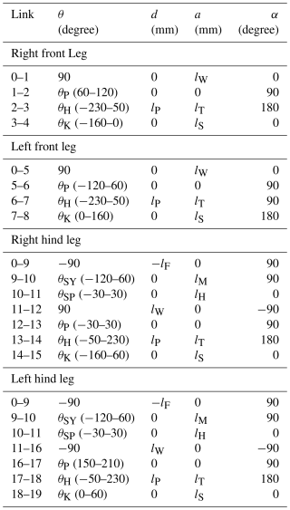 Using the D–H method from Niku (2001), the kinematic model of the robot is established. The D–H coordinate frames are shown in Fig. 3. The origin of the base frame (frame 0) is located at the midpoint of the line connecting the intersections of the hip roll and hip pitch axes of the front leg mechanisms, the x axis points vertically upward from the body, and the z axis points in the forward direction of the robot. Table 3 gives the D–H parameters.