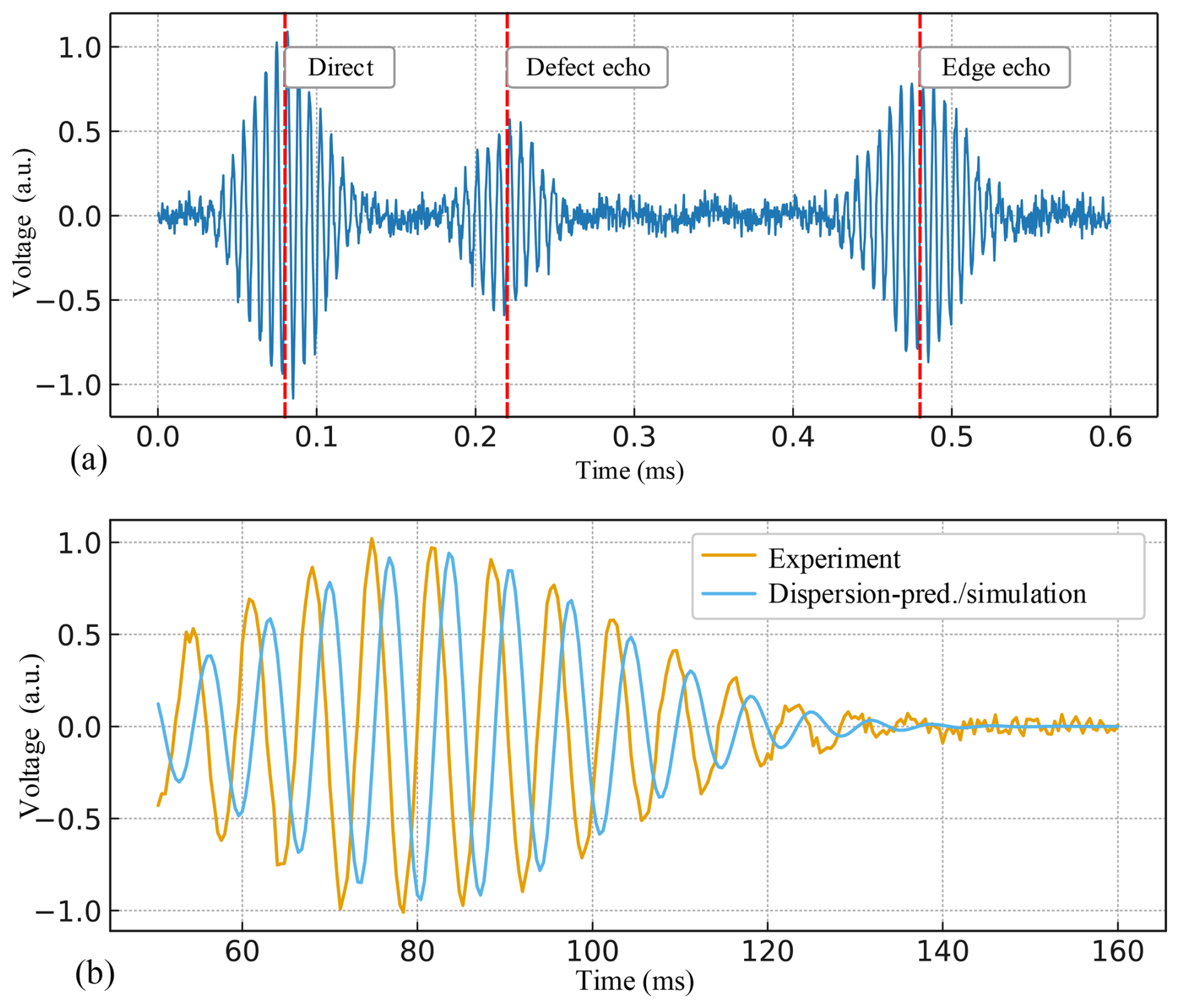 Figure 2Linear guided-wave characterisation on path P1: time domain response and 145 kHz experiment–simulation comparison. (a) Gated time domain response on path P1 under narrow-band excitation. (b) The 145 kHz experiment–dispersion and/or simulation check.