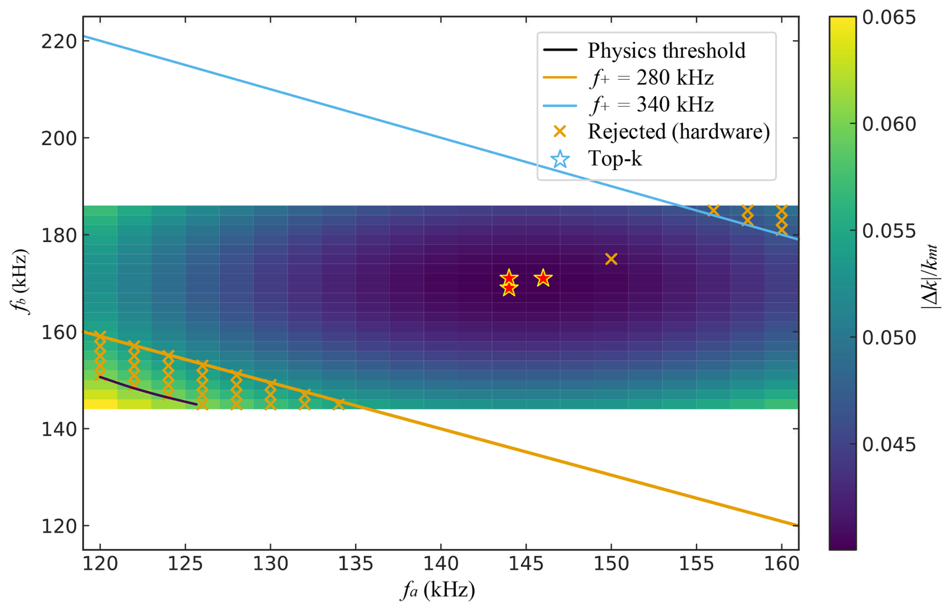 Pairs with small (equivalently small rΔk) yield long Lint and therefore a higher ceiling for coherent accumulation over a fixed Leff, as implied by Eq. (2). In practice, low-rΔk corridors in (fa,fb) serve as a physics-guided pre-filter before any hardware measurements are performed.