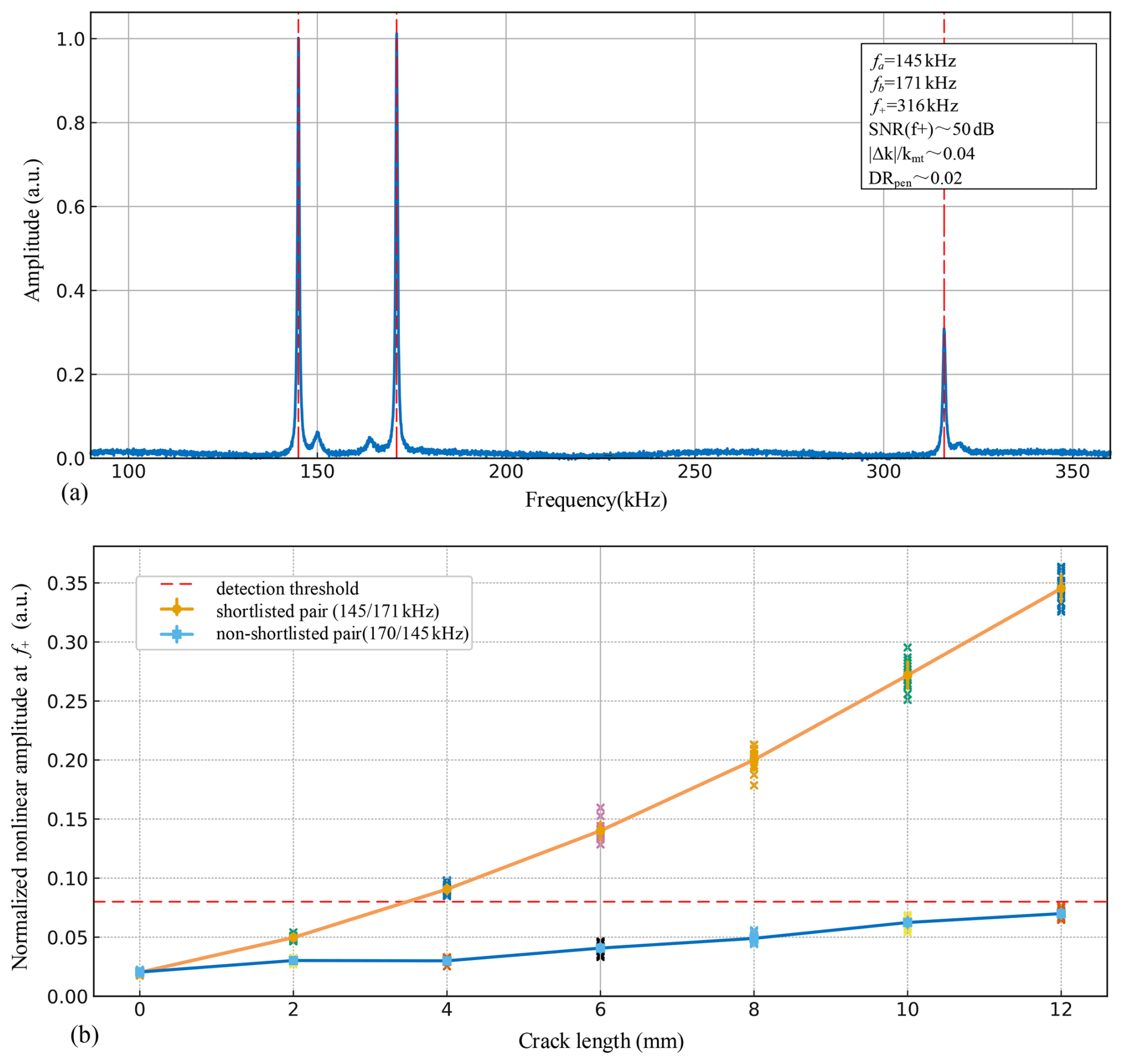 Figure 5SPI-4 nonlinear readout and crack growth sensitivity on path P1. (a) SPI-4 same-spectrum FFT for a shortlisted pair (145/171 kHz) on path P1. (b) Normalised nonlinear response at f+ versus crack length for a shortlisted (low-J) pair and a non-shortlisted (higher-J) pair on path P1.