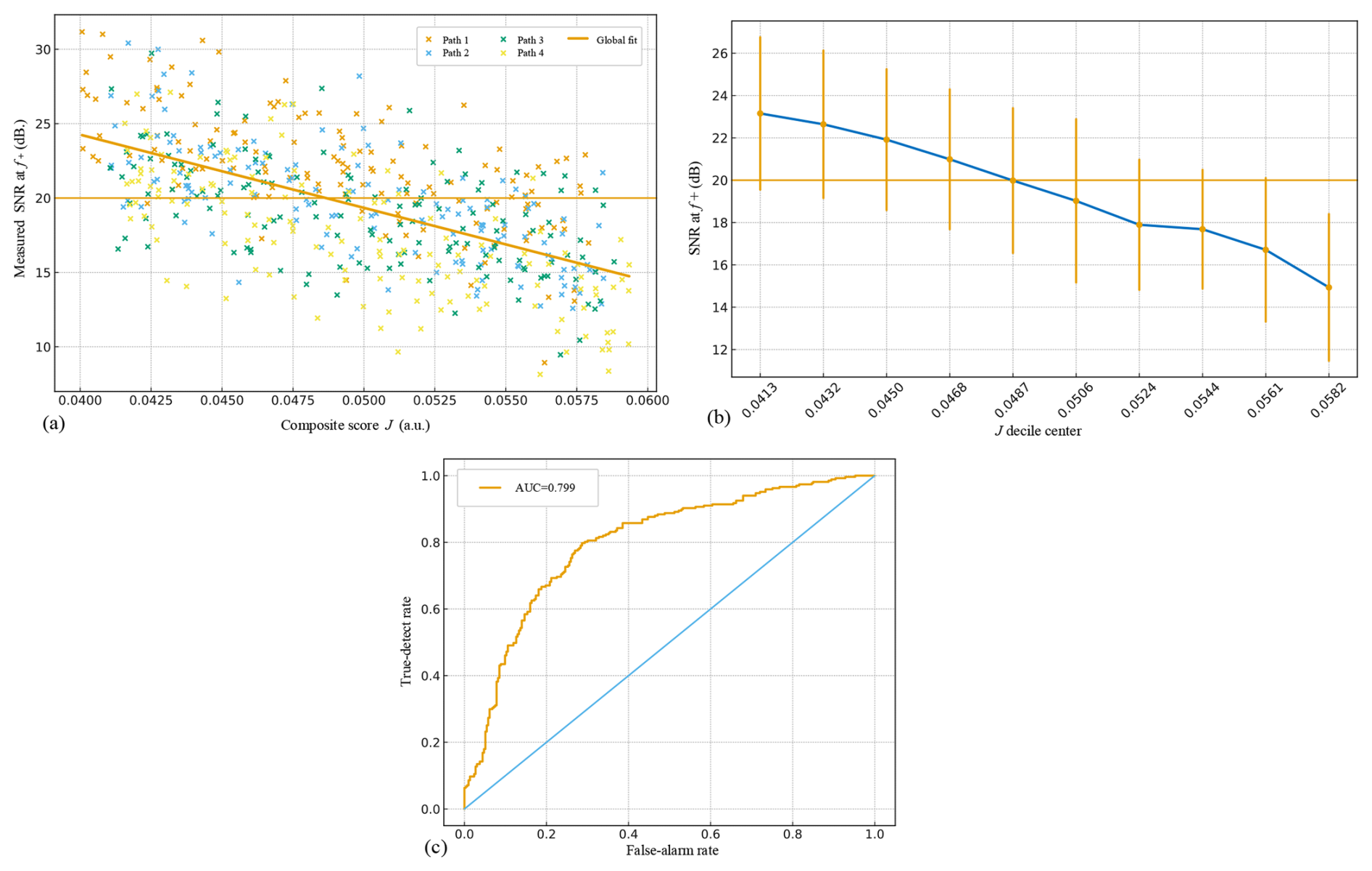Figure 6Global relationship between composite score J and measured detectability of the nonlinear mixed-frequency component. (a) Measured SNR(f+) versus composite score J across all paths. (b) Distribution of SNR(f+) binned by J deciles. (c) ROC-like curve for detection based on a threshold Jcut.